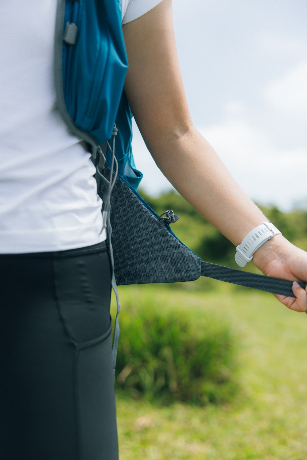 ▲蜂巢設計的透氣網孔散佈於肩帶與腰帶部位,身體貼近包包的位置,讓運動時所產生的大量熱氣能快速排出。也是少數小容量背包有做腰帶背負設計,在行進間能夠更舒適穩定。