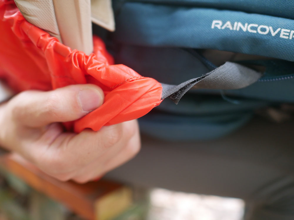 底部附有防水背包套,內部魔鬼氈固定,可直接套到包包上。
