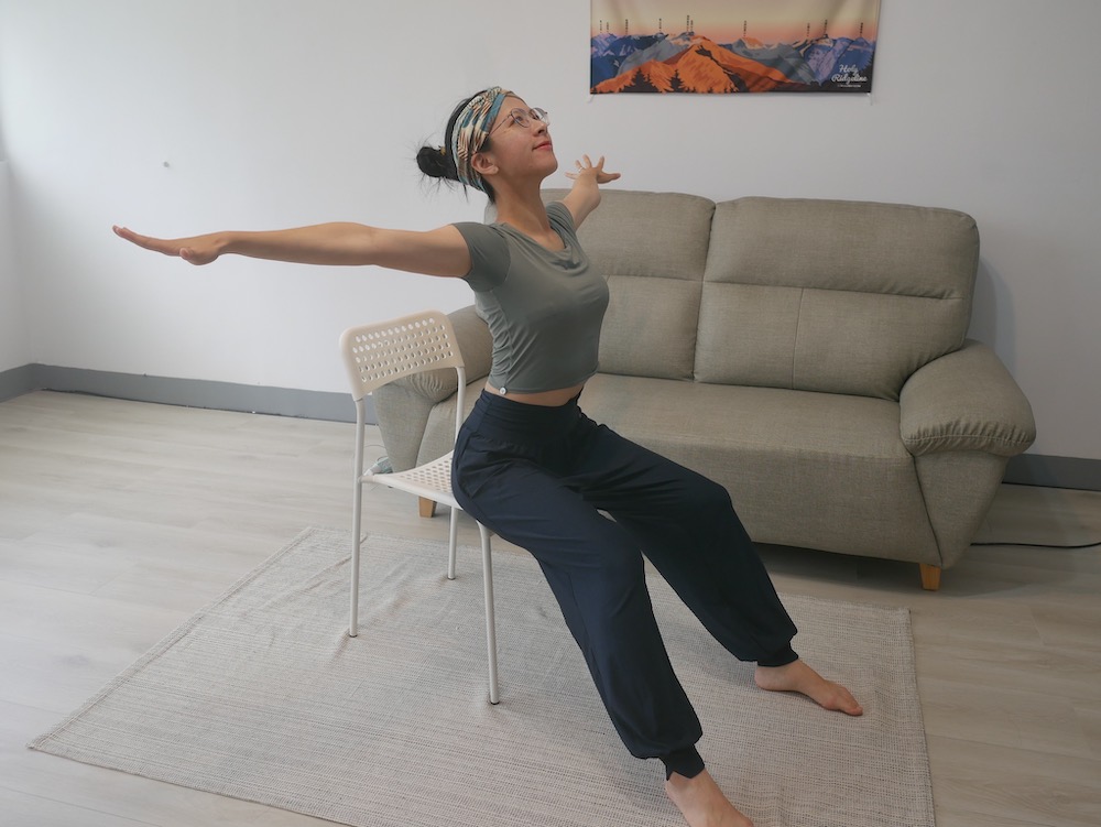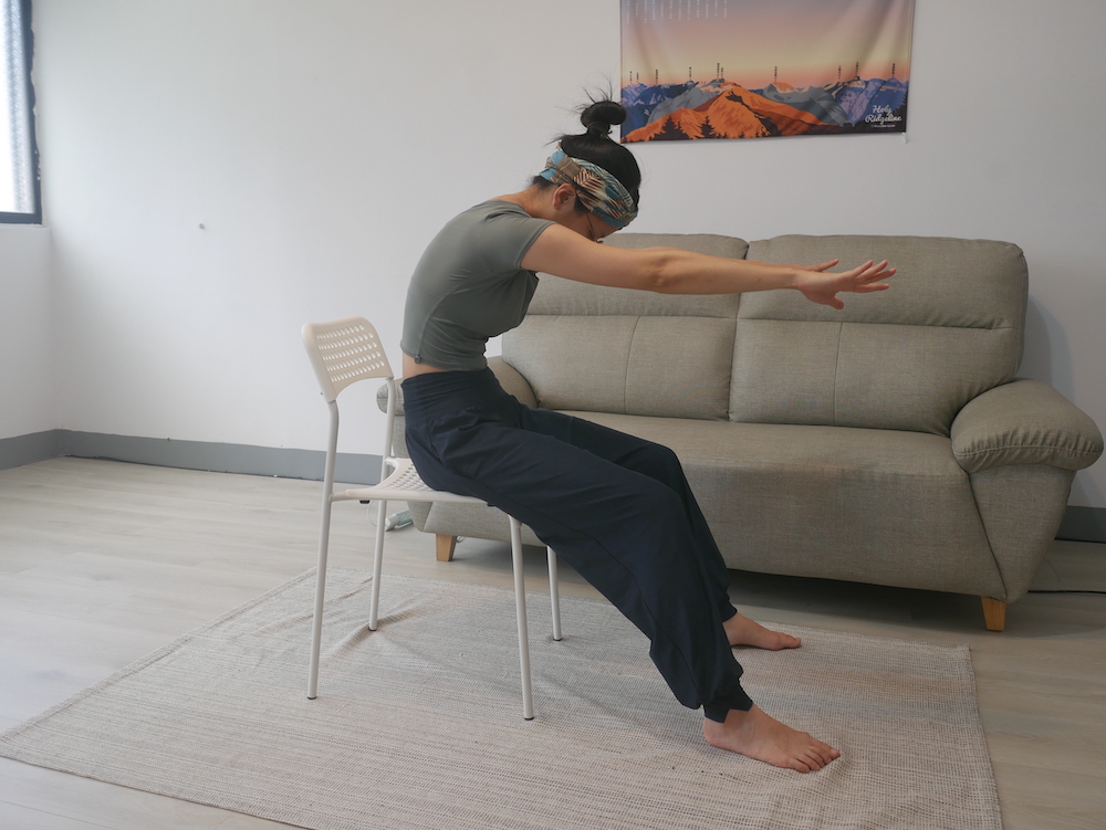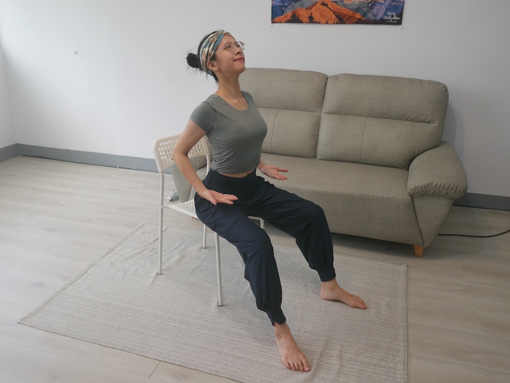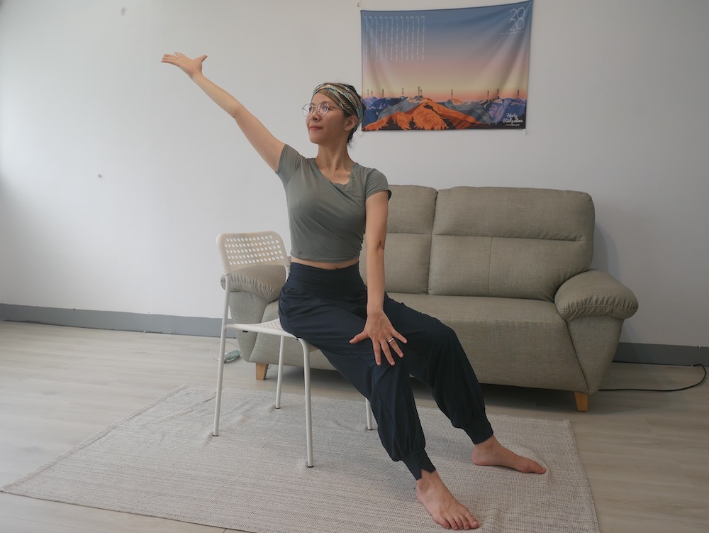 吸氣時右手往右上方打開、脊椎往右旋轉、吐氣時放鬆會到正面,兩個方向輪流。加強脊椎旋轉活動度,減少肩頸肌肉代償緊繃。