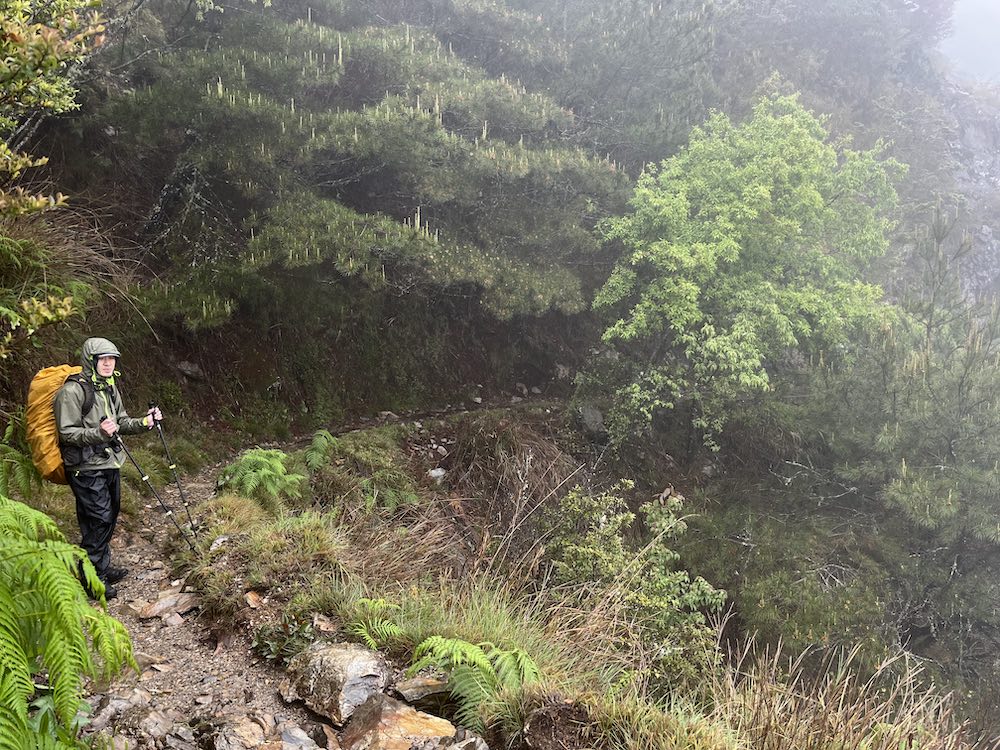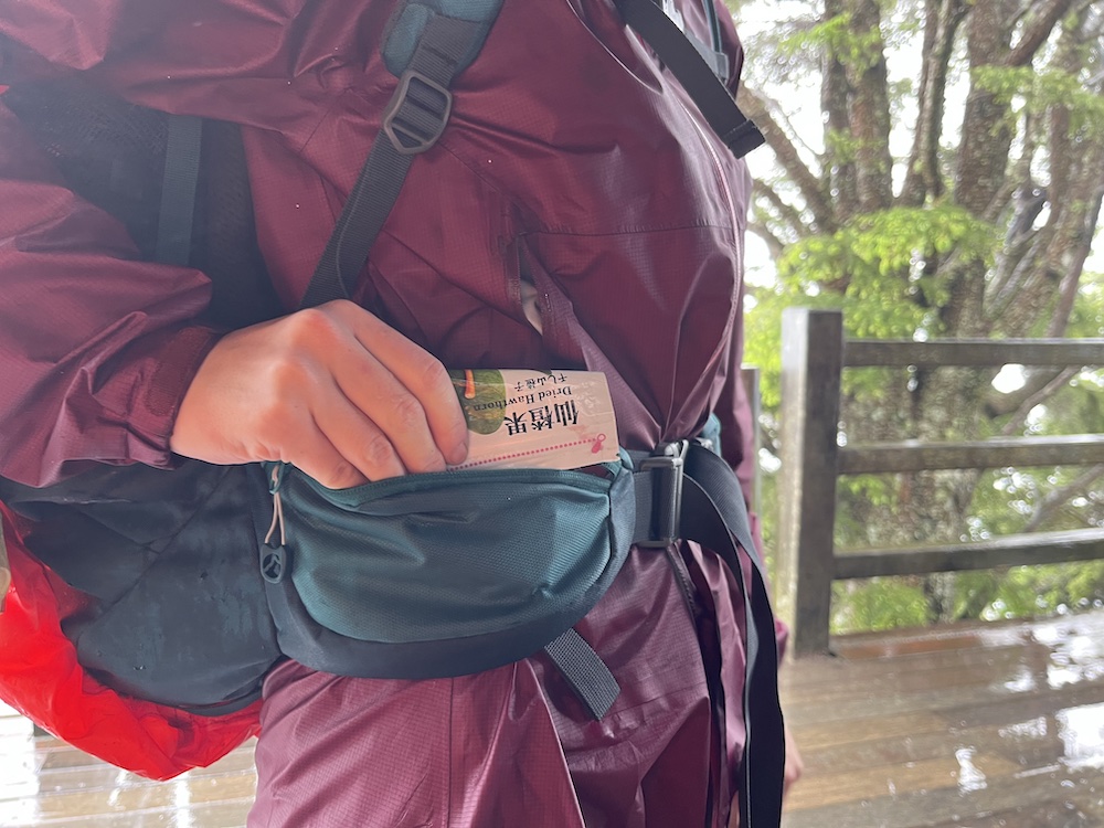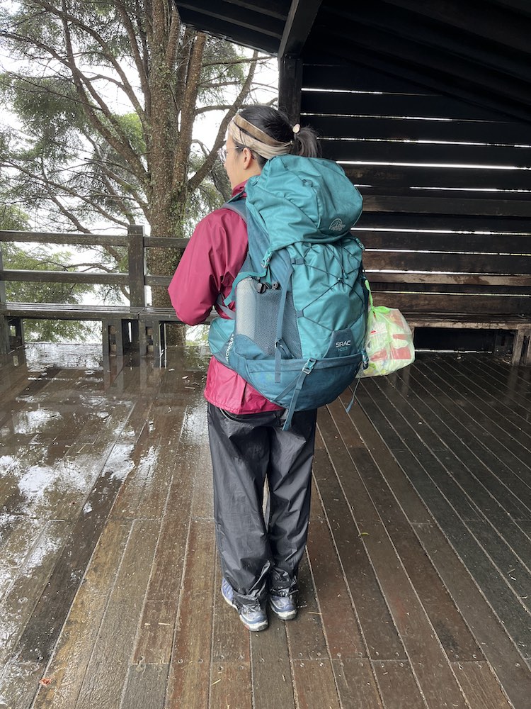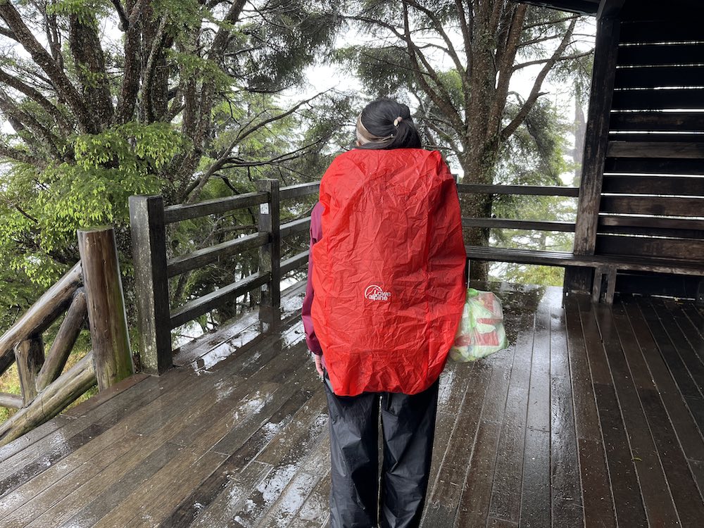 雨勢不小,大家的衣服跟鞋子都濕了,為避免天冷感冒,我們盡快下山。比起其他人的包,這顆包防水真的很棒!