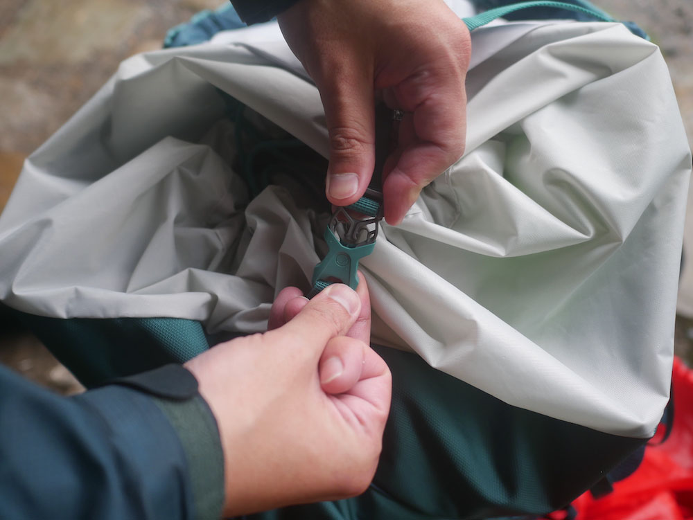 方便操作的壓縮系統,一手固定上環、一手拉繩,再扣上束帶,即可有效壓縮包內空間。