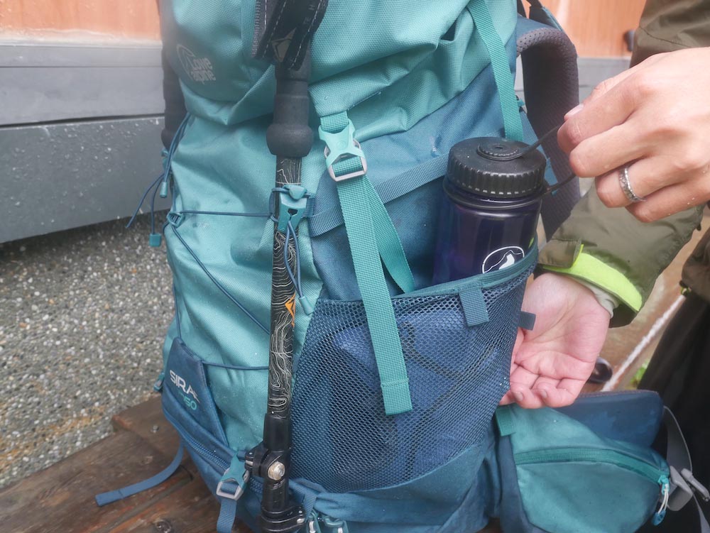 側邊網袋固定性很好,一側放山貓水壺、一側放保溫瓶。