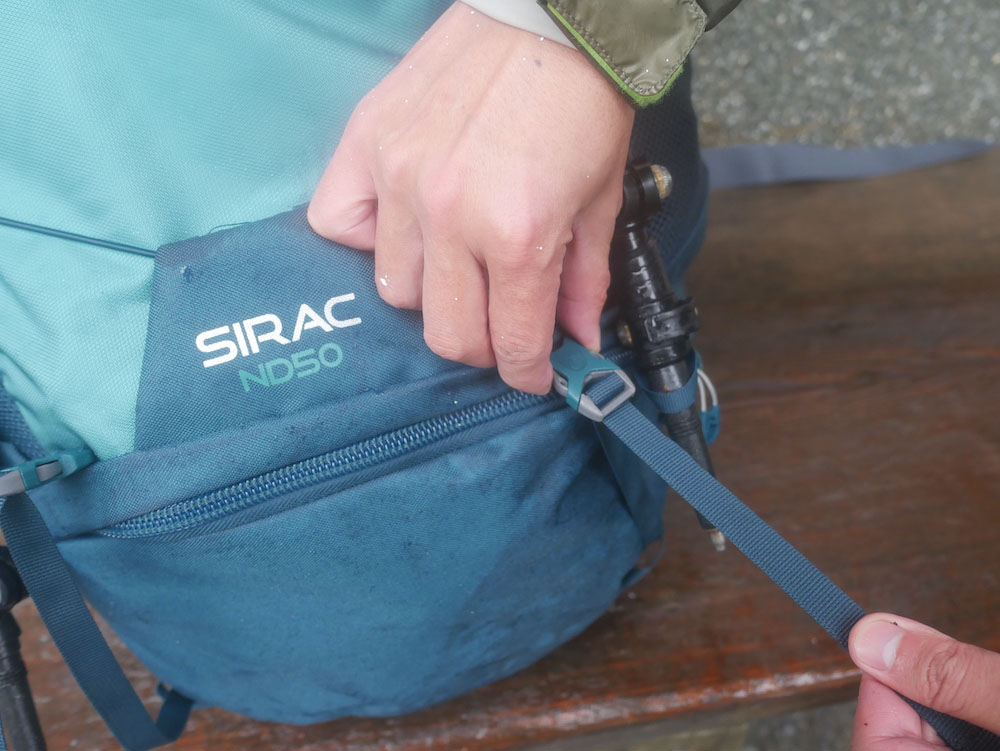 用不到登山杖/冰斧時,將其固定於包包上,彈力繩拉緊後下扣,就能提供良好的固定。彈力繩單手即可操作,使用上非常方便。