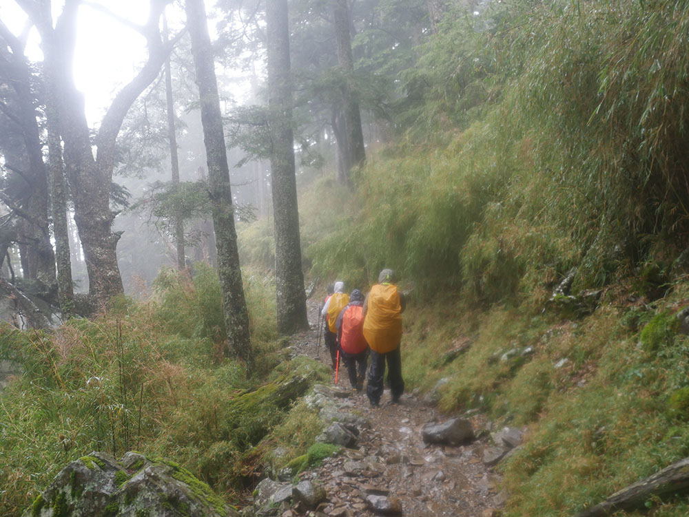 ▲08:30 從玉山登山口出發。天氣不太好,大家穿起雨衣雨褲、套上背包套,往排雲山莊前進。