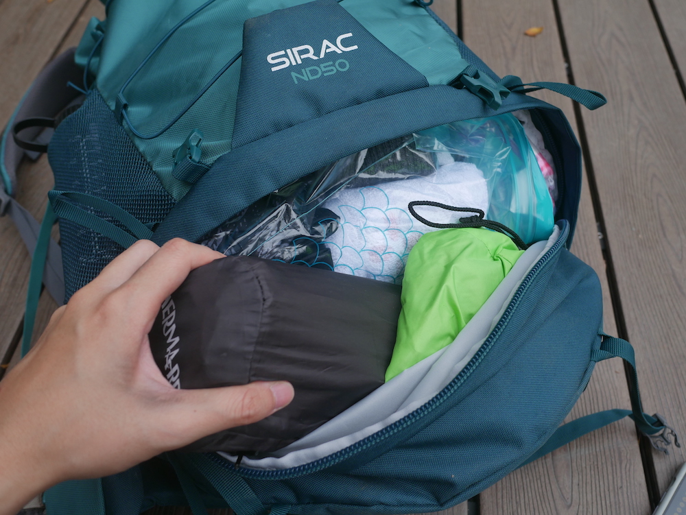 雖然整趟都在下雨,但是Sirac附的防水背包套包覆性很好!僅有包包底部內容物稍微濕掉,其他都是乾的。