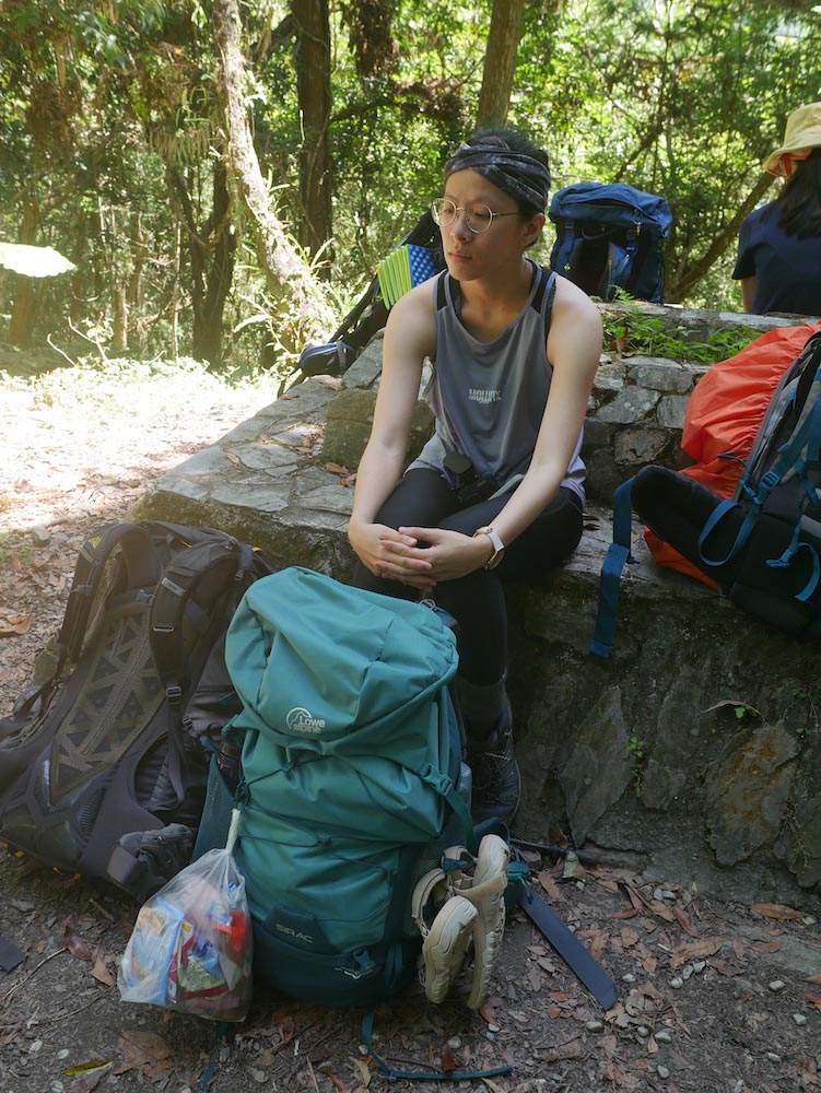 回到佳心營地,吃點東西休息一下。回程時把垃圾袋掛在登山杖固定繩上,就不會有垃圾飛走的問題了!