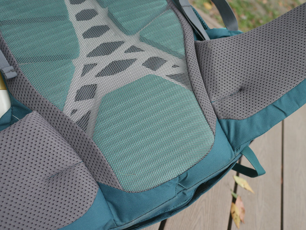 Sirac 獨家科技 Air Contour™ X 背負系統,使用輕量的彈簧鋼材、彈性尼龍包覆,重量輕支撐佳,網格狀背板使得包與身體接觸的部分能有良好的透氣。很適合台灣的登山環境,夏天時也很舒適!