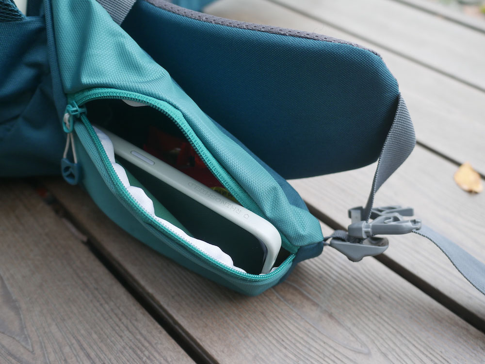 腰帶兩側皆有收納空間,且為浮動式的拉鍊口袋能不受腰帶影響可置入更多物品,更可以放行進間隨時拿取的東西:糖果、乾糧、面紙、手機等。