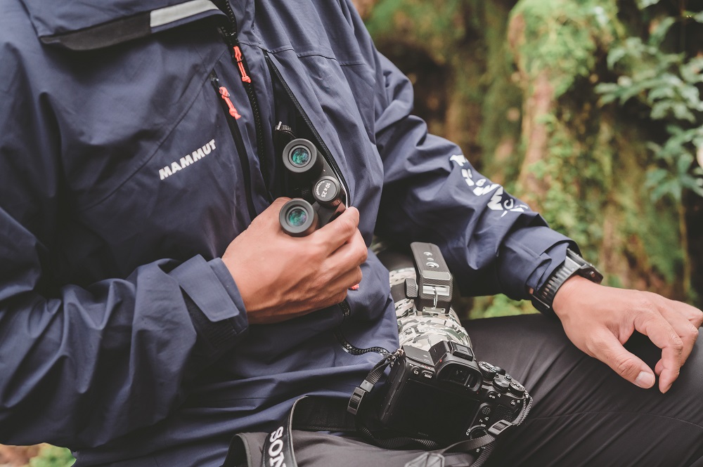 「我的衣服一定要以深色為主,主要是如果身上有太鮮豔的色系,你還來不及看到野生動物,看到你就先跑掉了!」除了機能性,郭熊也重視是否能隱身在森林中,DRYtechnology Pro布料與我們常見的Gore-tex,相較之下更有彈性、柔軟,能減少布料摩擦發出「唰!唰!唰!」的聲音,這對必須安靜等待野生動物出現的戶外使用者更為加分。