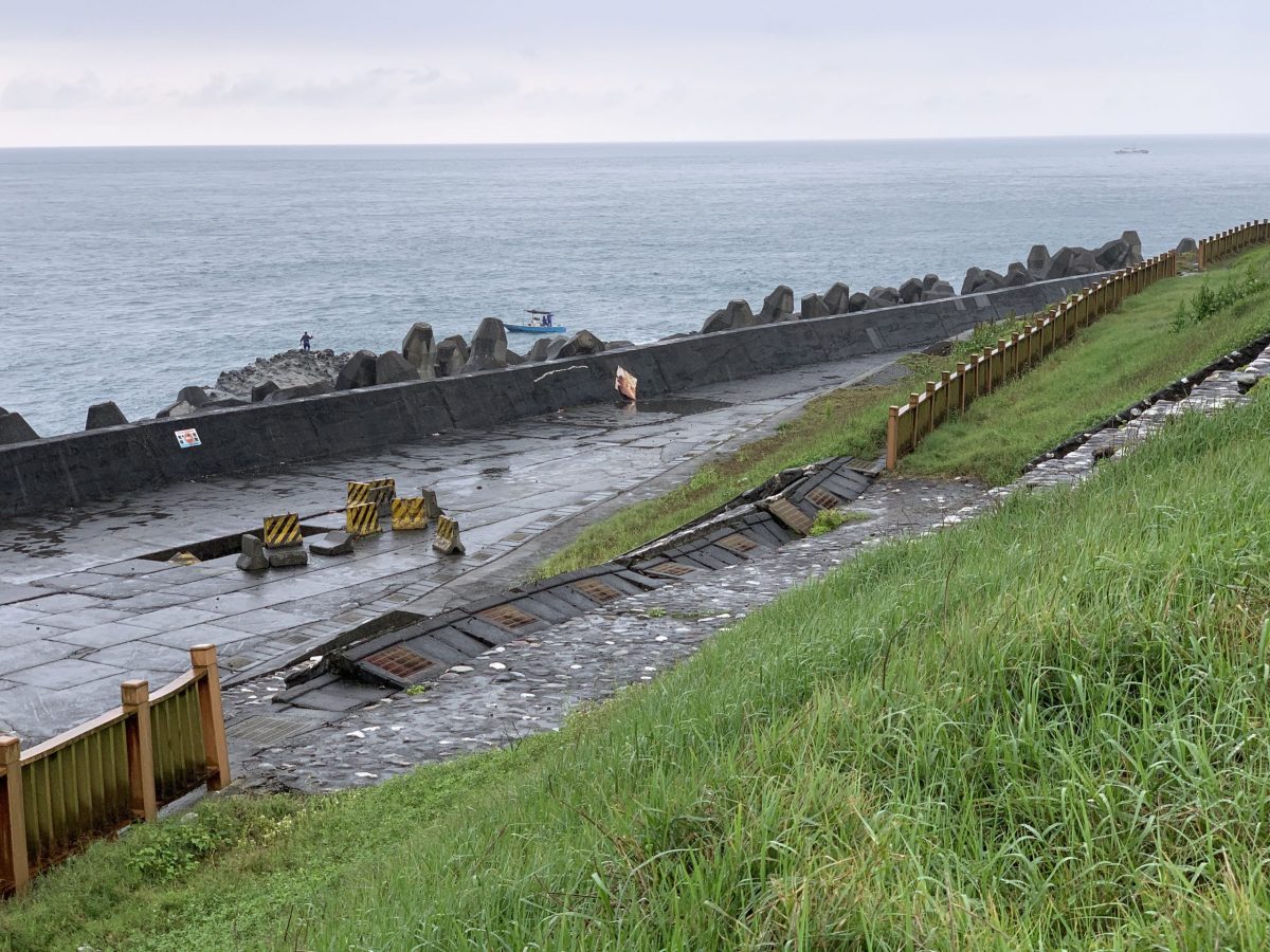 ▲海浪掏空消波塊周邊地基,導致岸上路面下陷、圍牆倒塌。