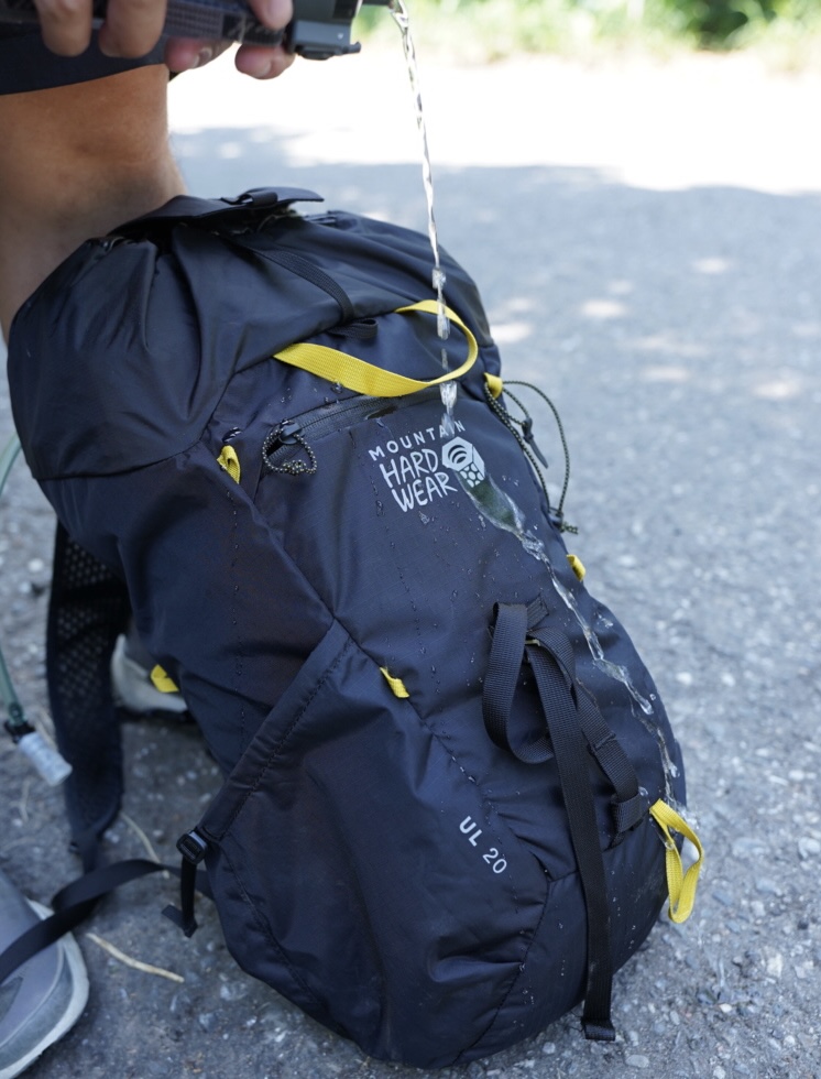 輕量、耐磨、防潑水、易收納,都是 Mountain Hardwear UL™ 20L Backpack 的優點,抗撕裂的 200D 再生尼龍材質,是我這趟實測的印象大好之處,除了不擔心被古道的樹枝割破,我也可以安心地將背包放在碎石上,不擔心會被磨損。除了防止背包撕裂外,背包也有防潑水的功能,我嘗試用水壺直接倒在背包上,水滴沿著背包滑落卻沒有因此變濕,這個優點在未來雨天時,也可以有效讓我節省套上防水套的時間。