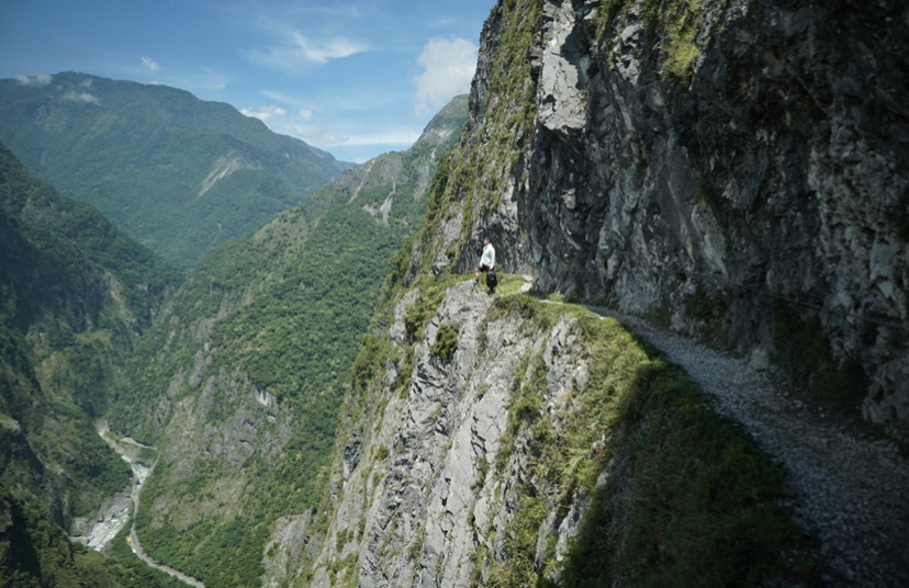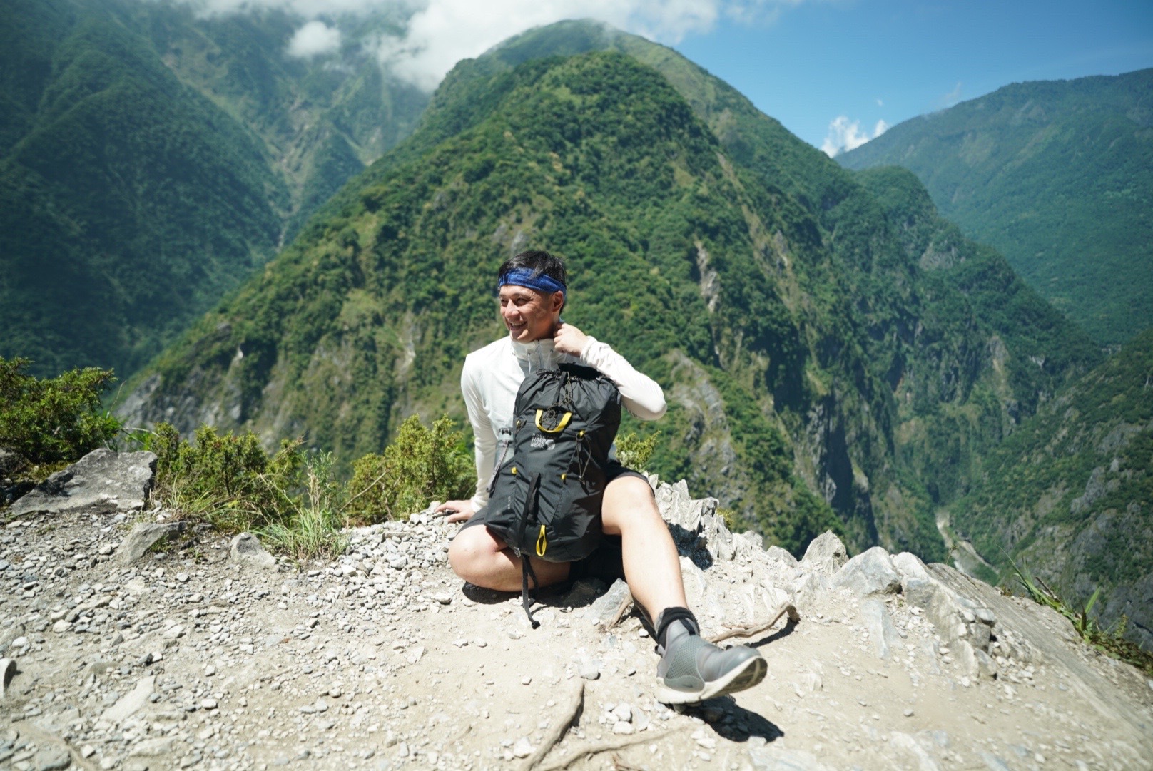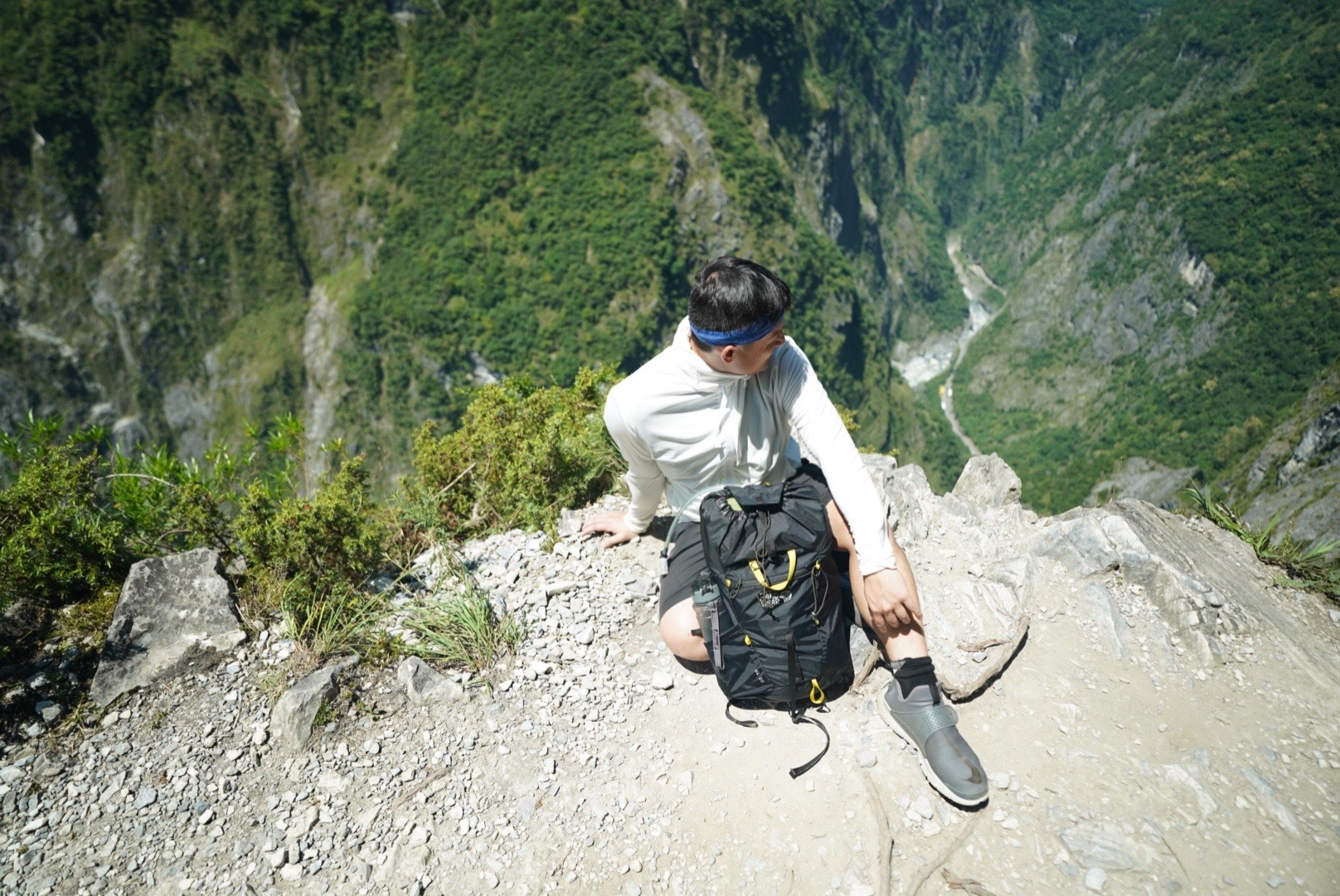 錐麓古道大部分路段只能通行一人,如果一個不小心,皆有可能墜落斷崖之下,大家看看我坐在斷崖旁,下方就是中橫公路和立霧溪。背包使用抗撕裂材質,讓我可以安心地把背包放在碎石上,也不擔心它會因此磨損