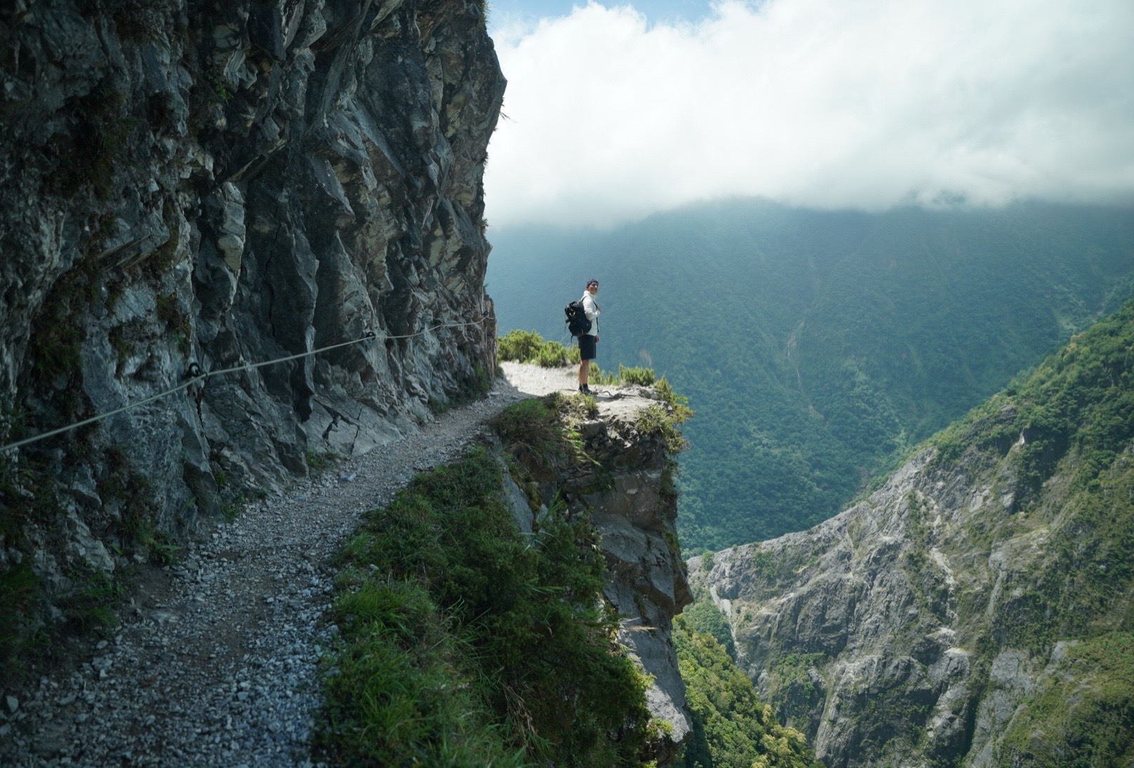 這裡是錐麓古道最美的拍攝景點之一,但要在這裡拍照必須要有強心臟,因為後方就是萬丈深淵,一定要做好安全評估才可以在此停留,而我坐在這裡時,也是一直用強顏歡笑,來遮掩我緊張的情緒。