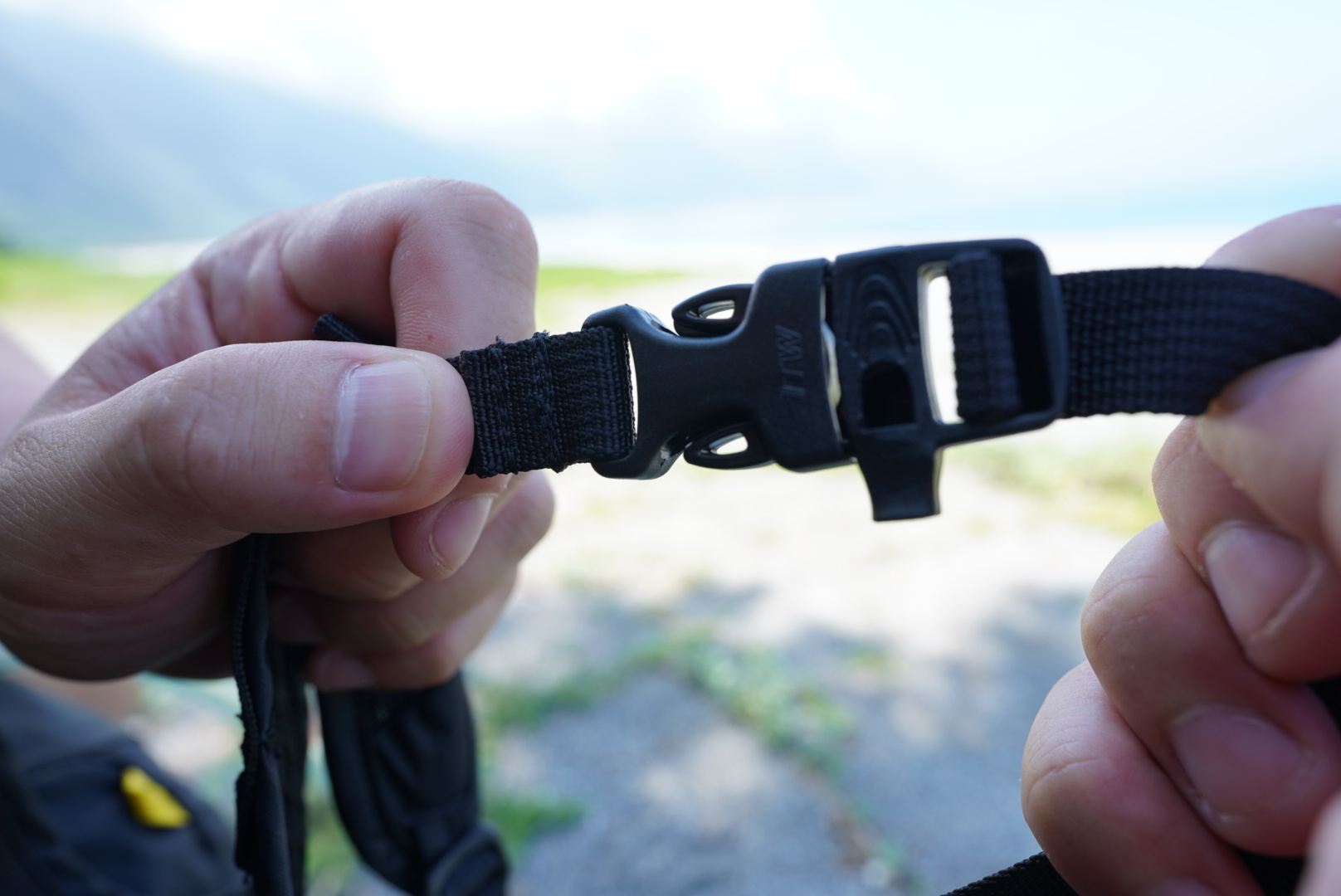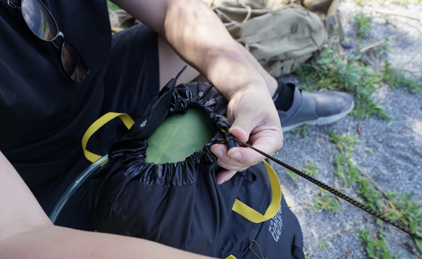 背包拉繩系統,讓我可以透過拉繩和扣環固定束口袋頂部。