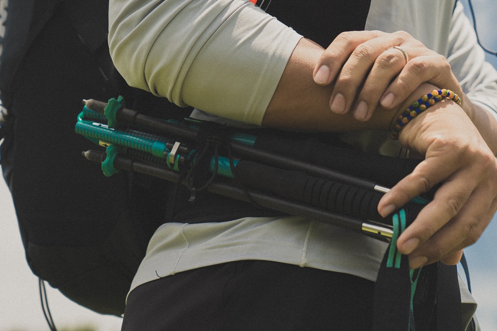 ▲若是使用折疊式登山仗,也可束綁在腰間,快速收取。