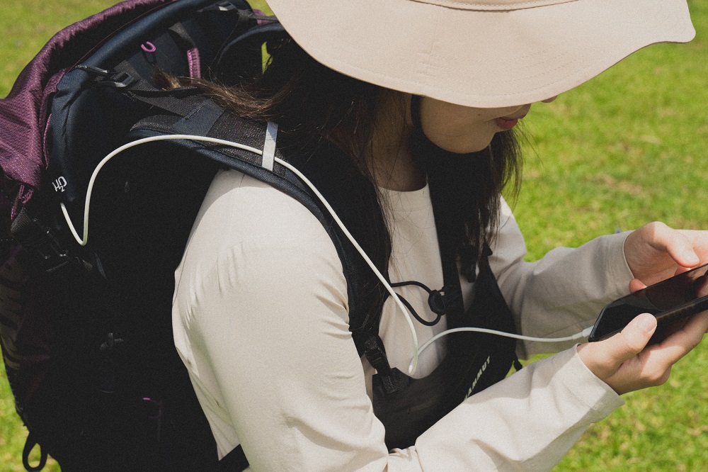 ▲均均將水袋吸管孔作為固定充電線使用,行進間為手機充電時,也不怕充電線纏繞在身上或是垂掛造成行進不便。