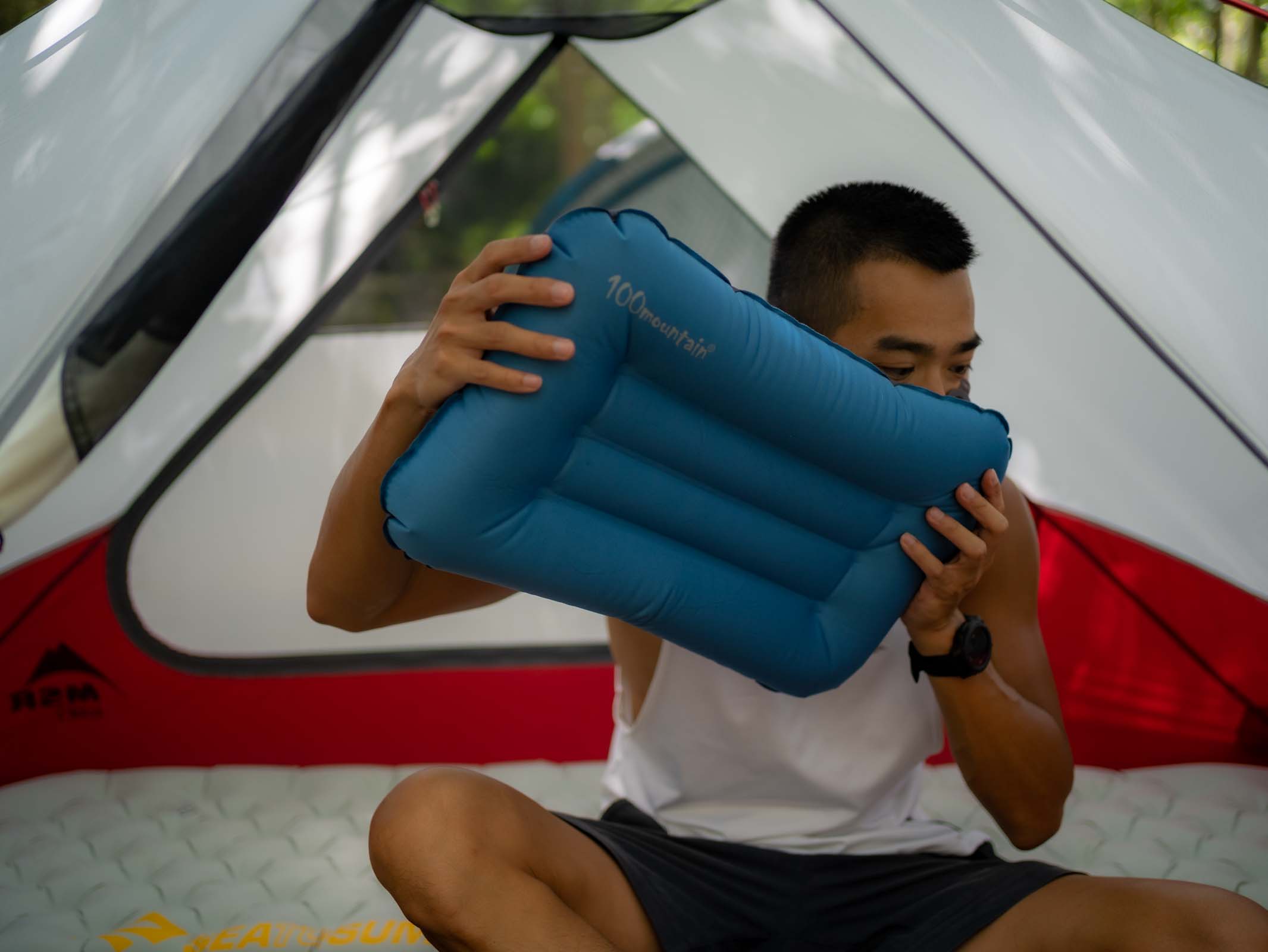台灣百岳自家品牌輕量充氣枕,設有逆止閥,輕鬆吹氣即可完成充氣,材質採用 50D 彈性布面,柔軟親膚,頸部與頭部設有高低差,能更符合人體工學,重量及收合體積皆屬於野營輕量等級,價格也平易近人,算是極輕量露營枕頭入門款,不過由於不可機洗,建議使用時可墊個手帕或布,或使用完用清水擦拭風乾。