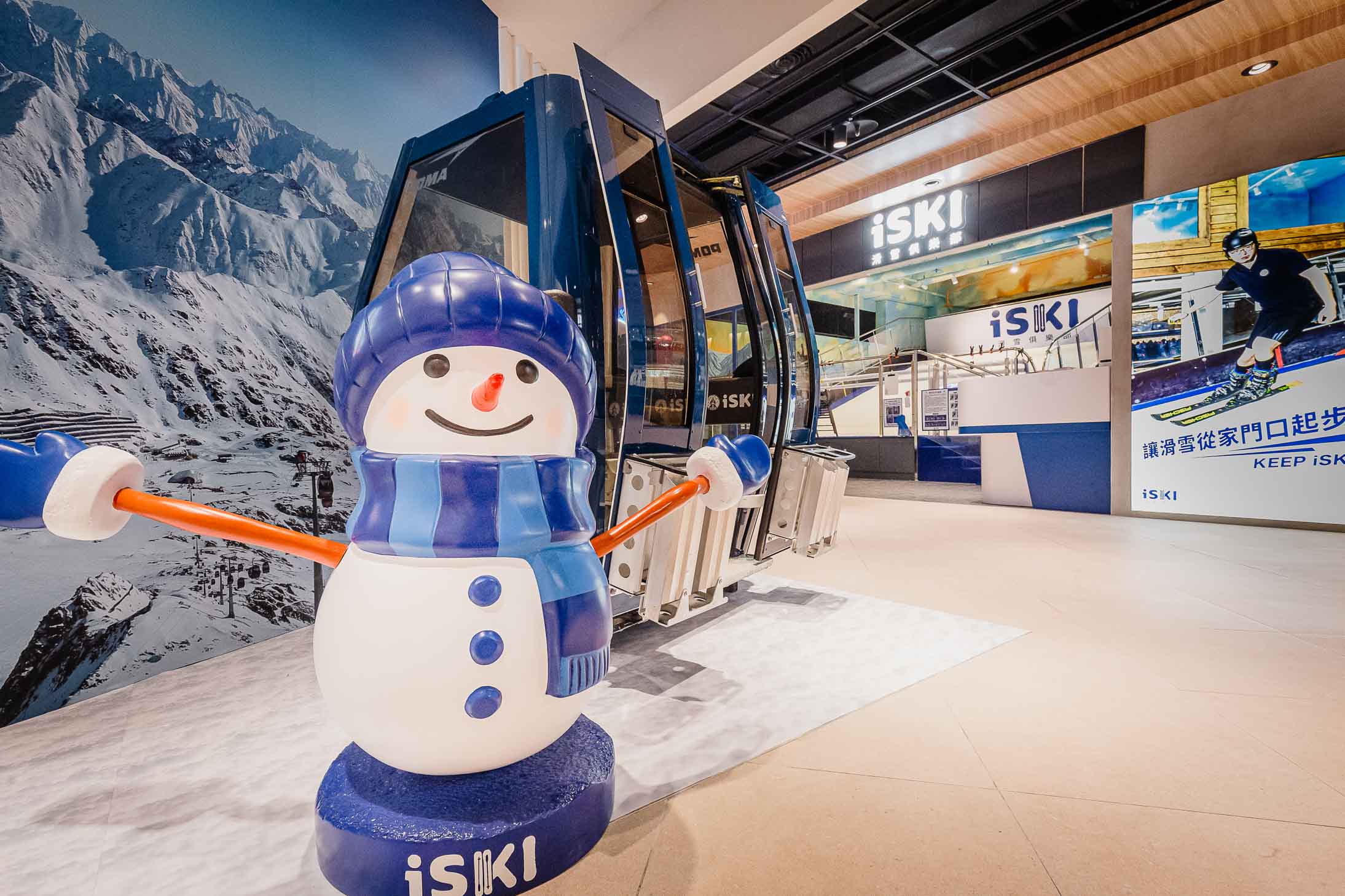 iSKI 滑雪俱樂部,繼插旗台北、新竹後,再度展店至桃園,是桃園首間室內滑雪場,也是台灣唯一設立在百貨商場內的滑雪場,選址位於環球桃園 A19 百貨商場,搭乘桃園捷運至 A19 體育園區出站即可抵達,為喜愛滑雪的桃園民眾提供了交通便捷的滑雪場地。設計上也大量運用木造元素,打造小木屋休憩情景,同時設有雪國熱門造景打卡點,從法國原裝進口滑雪場纜車與訂製雪人,傳遞雪國意象。
