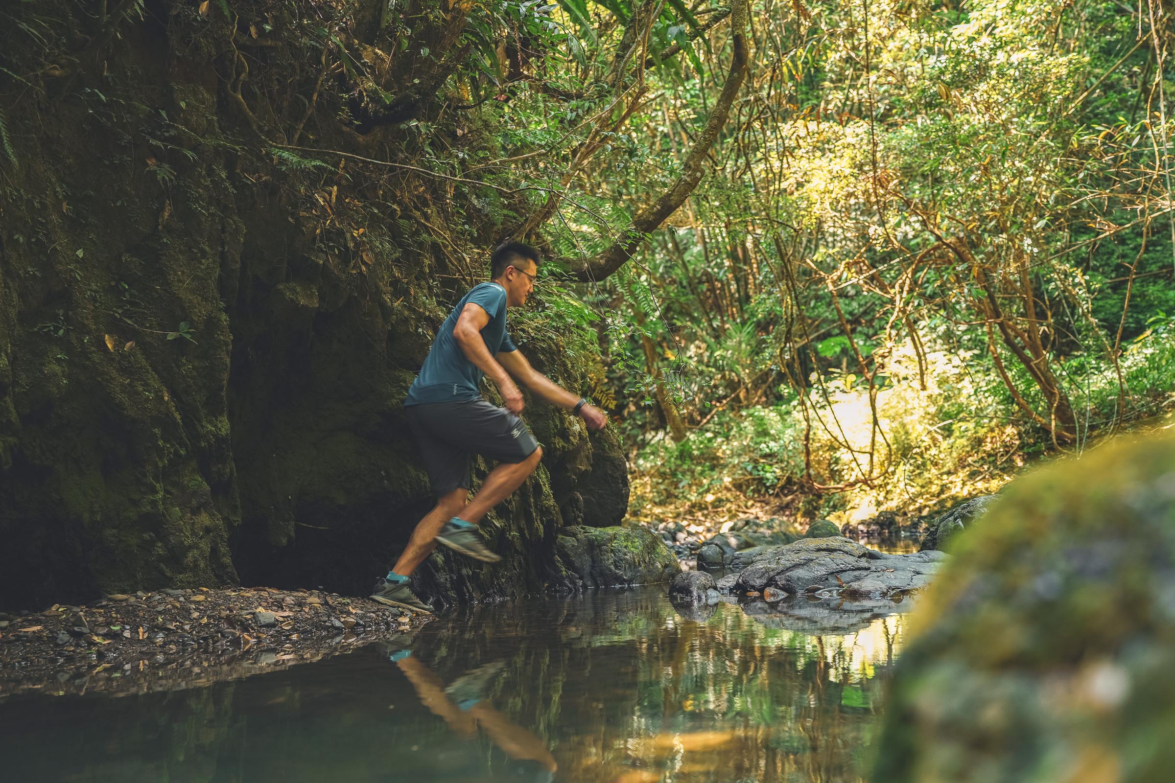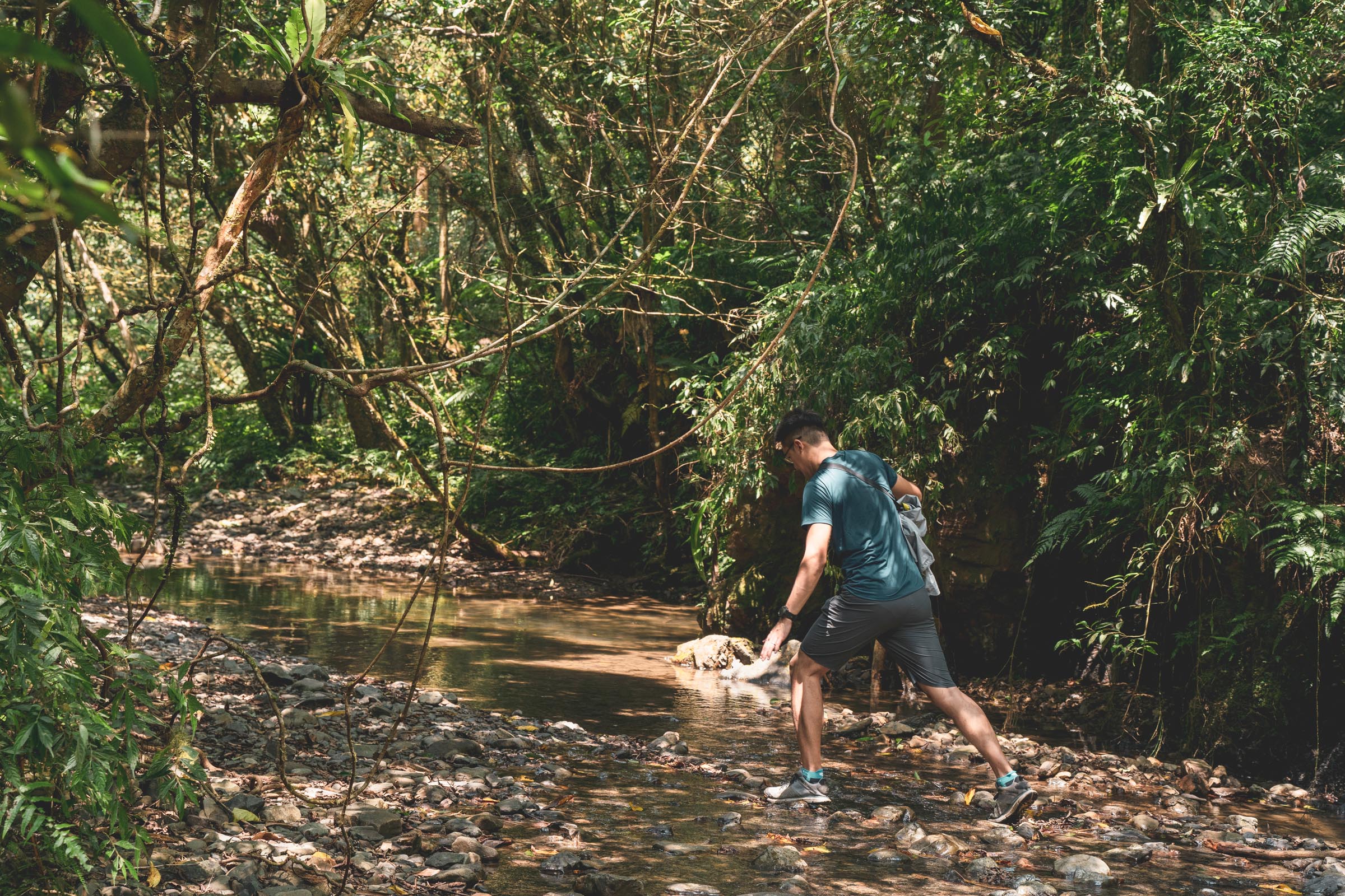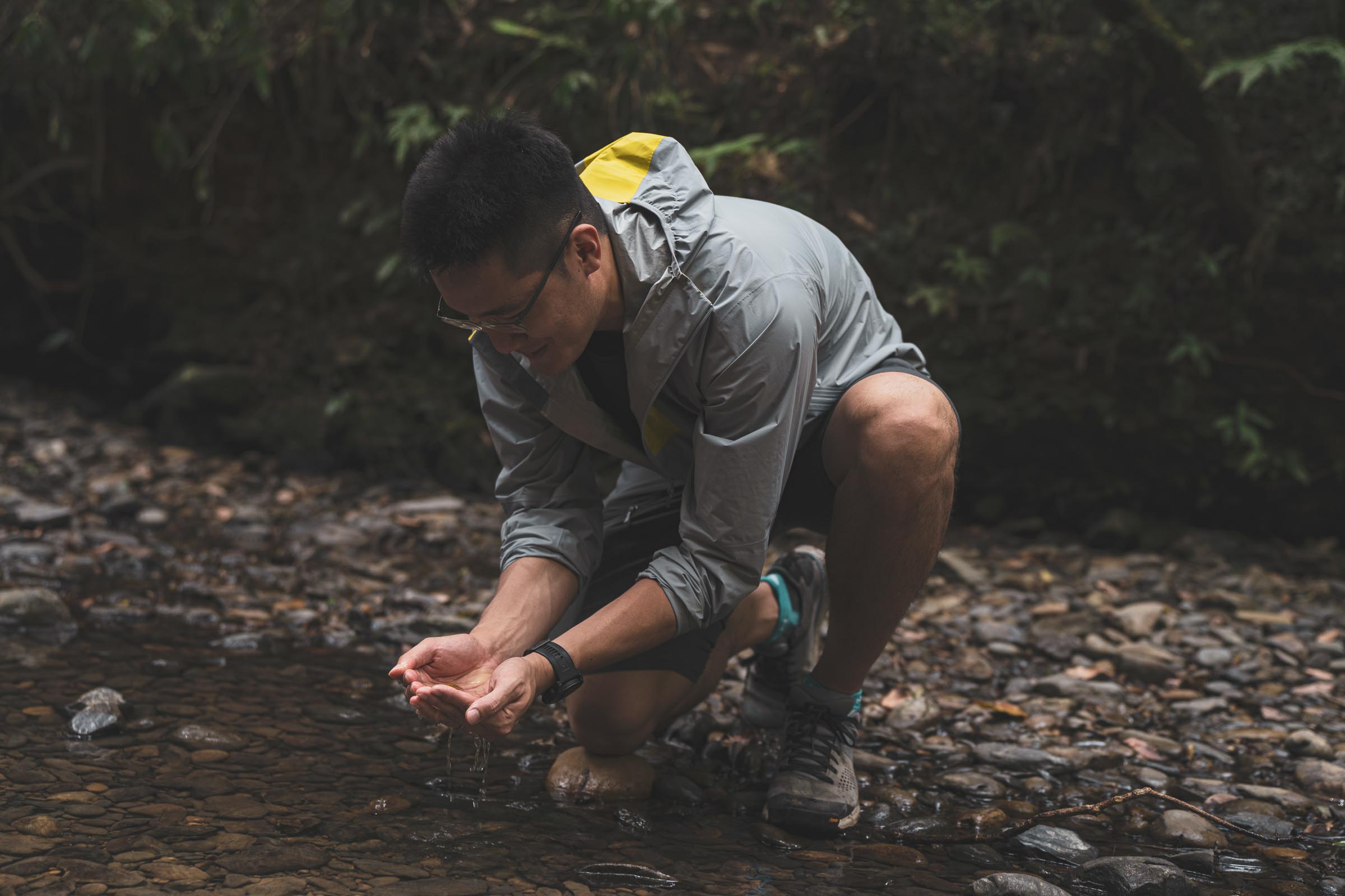 ▲ 淡蘭古道旁小溪綿延,用沁涼的溪水洗把臉,真過癮!Haglofs L.I.M GoreTex 防水外套,彈性袖口設計能方便捲袖掬水。