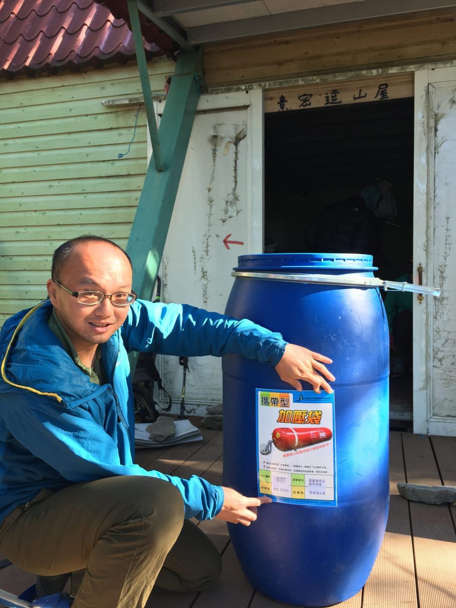 ▲目前全台各大山屋皆有放置加壓艙(除七卡山莊因為距離登山口近未設置),並放置於如圖中的塑膠桶內。圖為王士豪醫師團隊費盡千辛萬苦,終於將加壓艙設置在聖稜線中間點,素密達山屋。