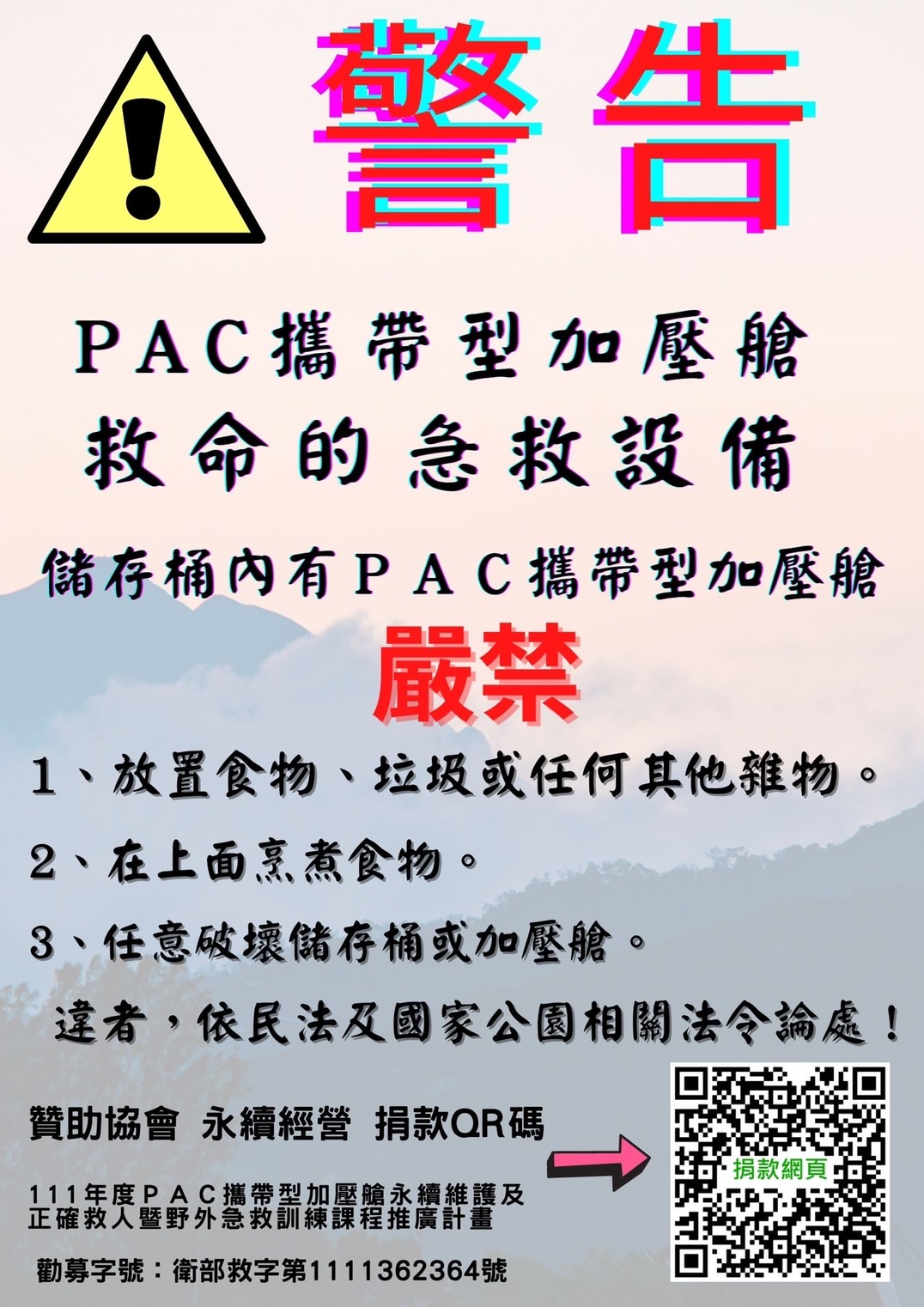 - 如已出現高海拔肺水腫、腦水腫症狀,就要立刻下撤。如暫時無法下撤,可以先運用山屋置放的加壓艙,為嚴重高山症患者保住一命。