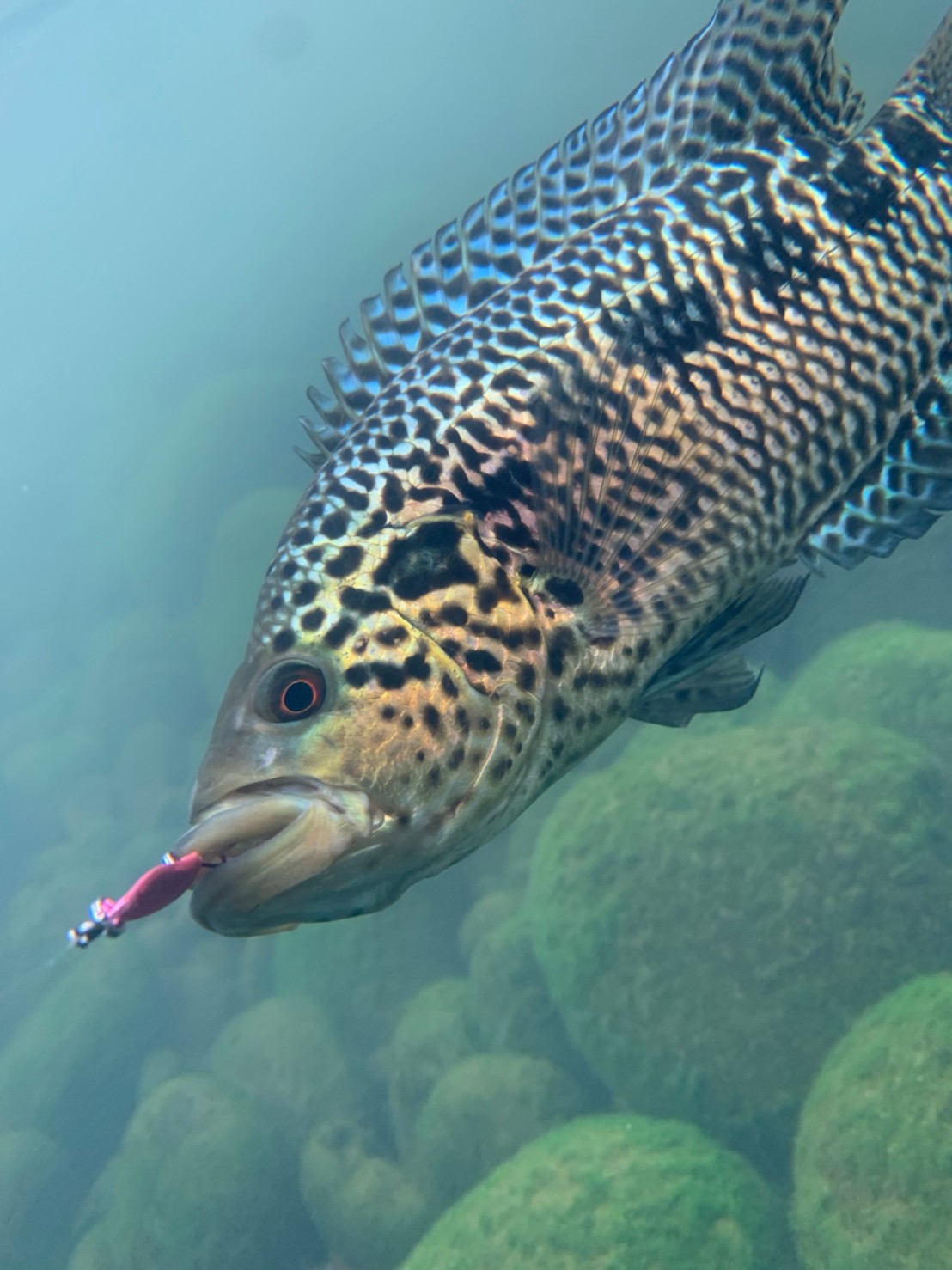 ??珍珠石斑:原產於中美洲哥斯達加南部至宏都拉斯之淡水域。 曾被引進台灣為觀賞魚,為兇猛之肉食性魚類,以小魚為食。親魚具有築巢產卵並護幼之行為。體型約20-30公分。在台灣主要分布在中南部水庫湖泊及河川。