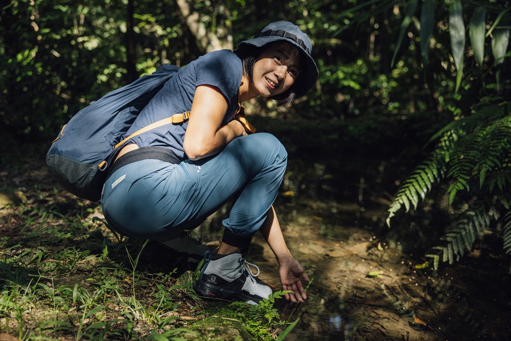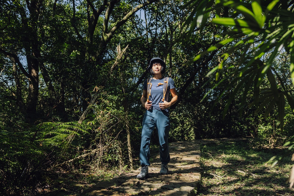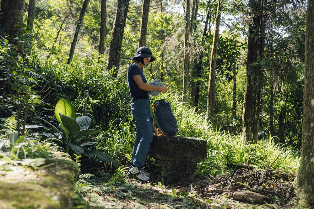▲庭安笑說工作的時候都捨不得穿太好的褲子,深怕弄髒不好清潔,但 Haglofs L.I.M Fuse 表面無氟碳化合物處理可抗汙,可安心隨地坐在樹上或是石階上休息。