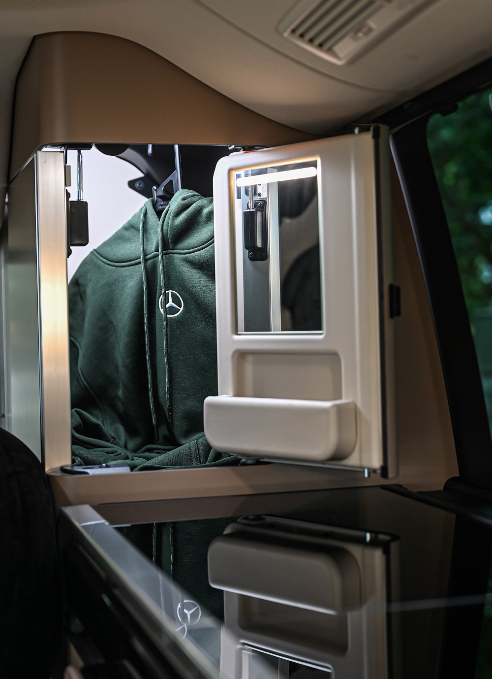 透過 Mercedes-Benz Advanced Control 智能遙控 (MBAC) 來開啟上掀式車頂後,即可展開長 2.05 公尺、寬 1.13 公尺的寬闊雙人臥鋪,並於兩側配置拉鍊式透光紗簾,保持通風,也能呼吸到大自然的新鮮空氣。