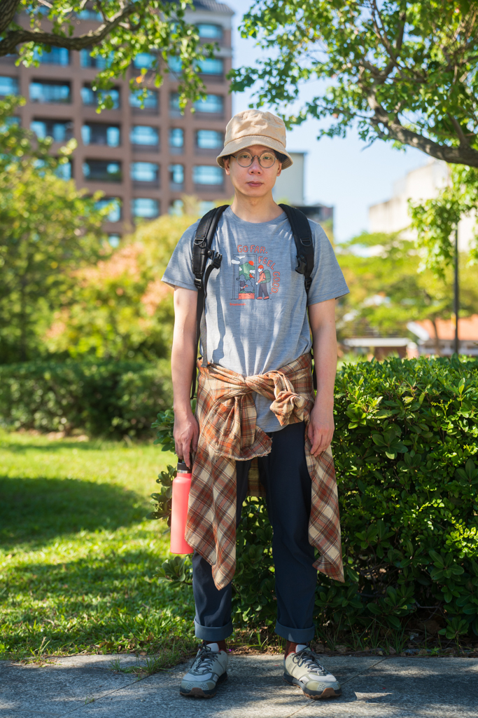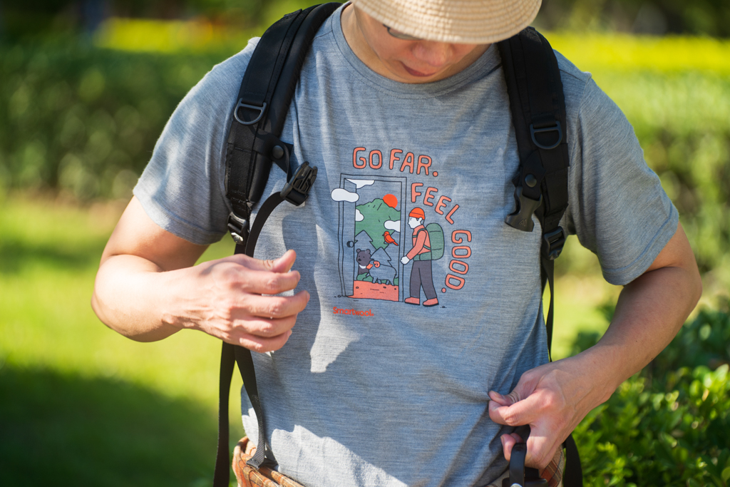 身為一名插畫藝術家,Vic 對於戶外裝備的要求,除了在意性能表現、適不適合自己外,也特別在意產品線條的呈現:「很多傳統登山裝備,是為了極限探索或極端氣候而生,線條就很剛硬!」他坦言有很多戶外裝備是為了國外的氣候而生,並不全然適用於台灣,例如:爬合歡北峰這種 A 級山就不一定需要使用到特別強悍機能性的產品,在城市與戶外間其實是可以抓到一個平衡取捨的,當然我們不會穿著棉質衣物上山,但當你了解各種材質的功能應用時,就能在中間適度的調配,加入一些城市元素,讓整體穿搭線條更柔和,就如同今天 Vic 實著的這件自己的作品-Smartwool x manual_for_all 聯名款美麗諾羊毛塗鴉 Tee,除了濕氣管理、溫度控制、抑菌抗臭等機能性,也修飾了戶外裝備剛硬的線條,能應用於戶外及城市等多種情境。