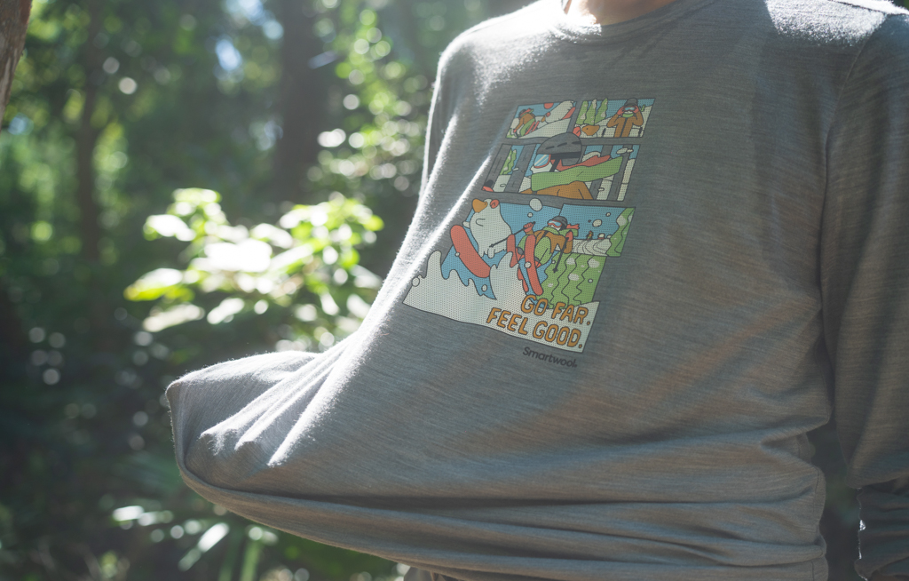 「Smartwool 美麗諾羊毛衣,穿著不會感到刺癢,聚酯纖維更增添彈性,便於活動。」Vic 跟我們分享今日實著 Smartwool 塗鴉 Tee 的體驗,美麗諾羊毛本身親膚特性不容易刺癢,混紡聚酯纖維則提供了其彈性、快乾及韌性,適合需要大活動度的戶外玩家,並且也提升了商品的耐用性,讓資源更永續。
