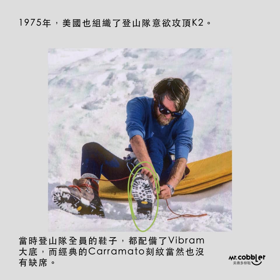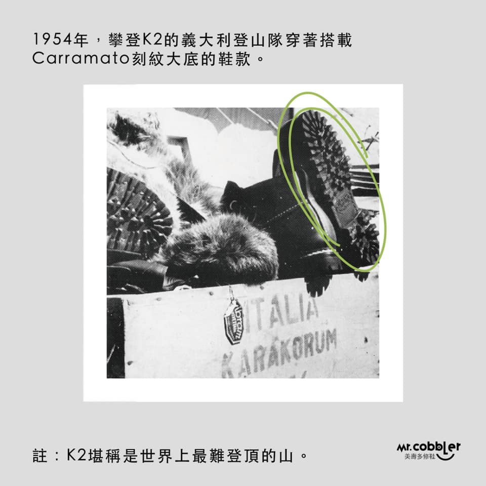 1954 年,全世界第一支登上 K2 的義大利遠征隊,就是穿 Vibram 的橡膠鞋底。至此之後,Vibram 聲名大噪,世界各大登山鞋品牌也開始陸續投入自家鞋底科技研發。