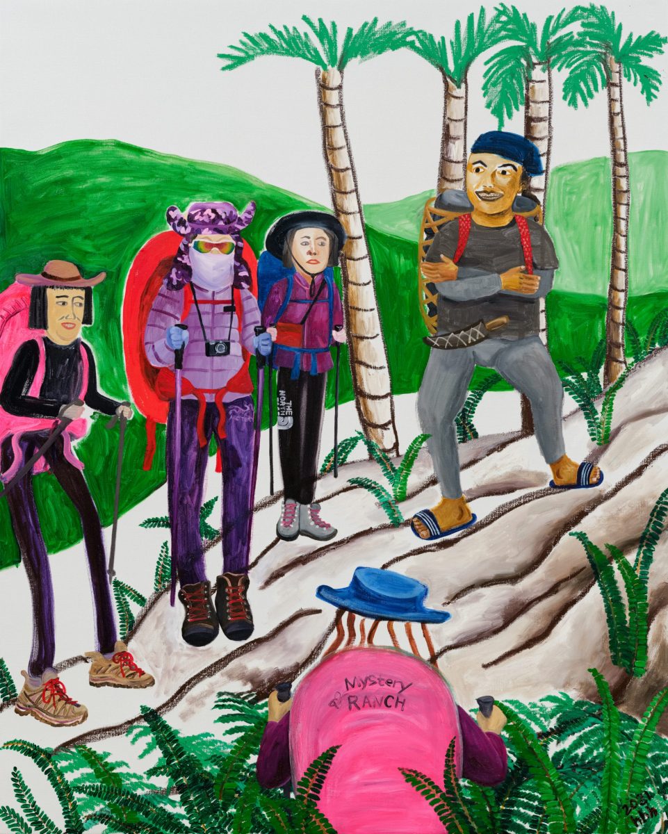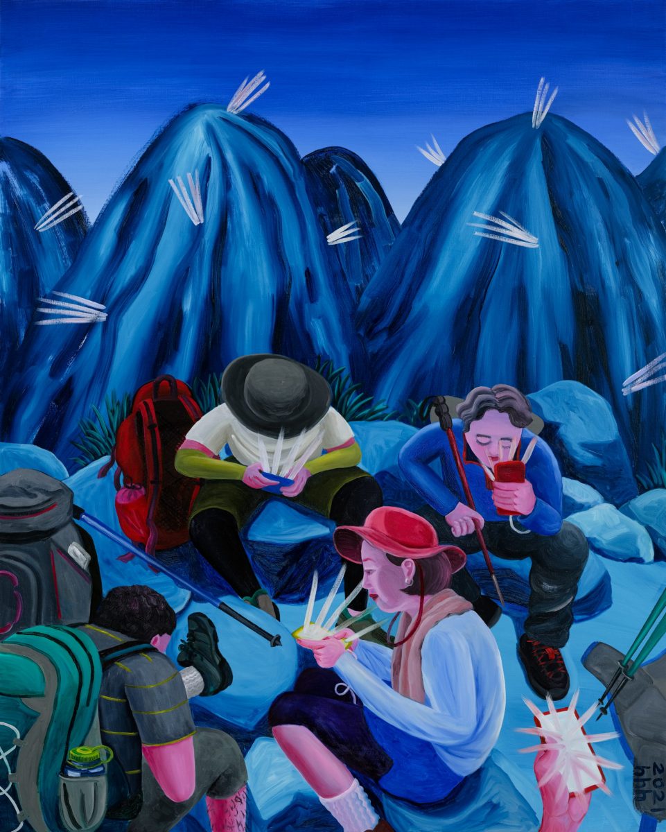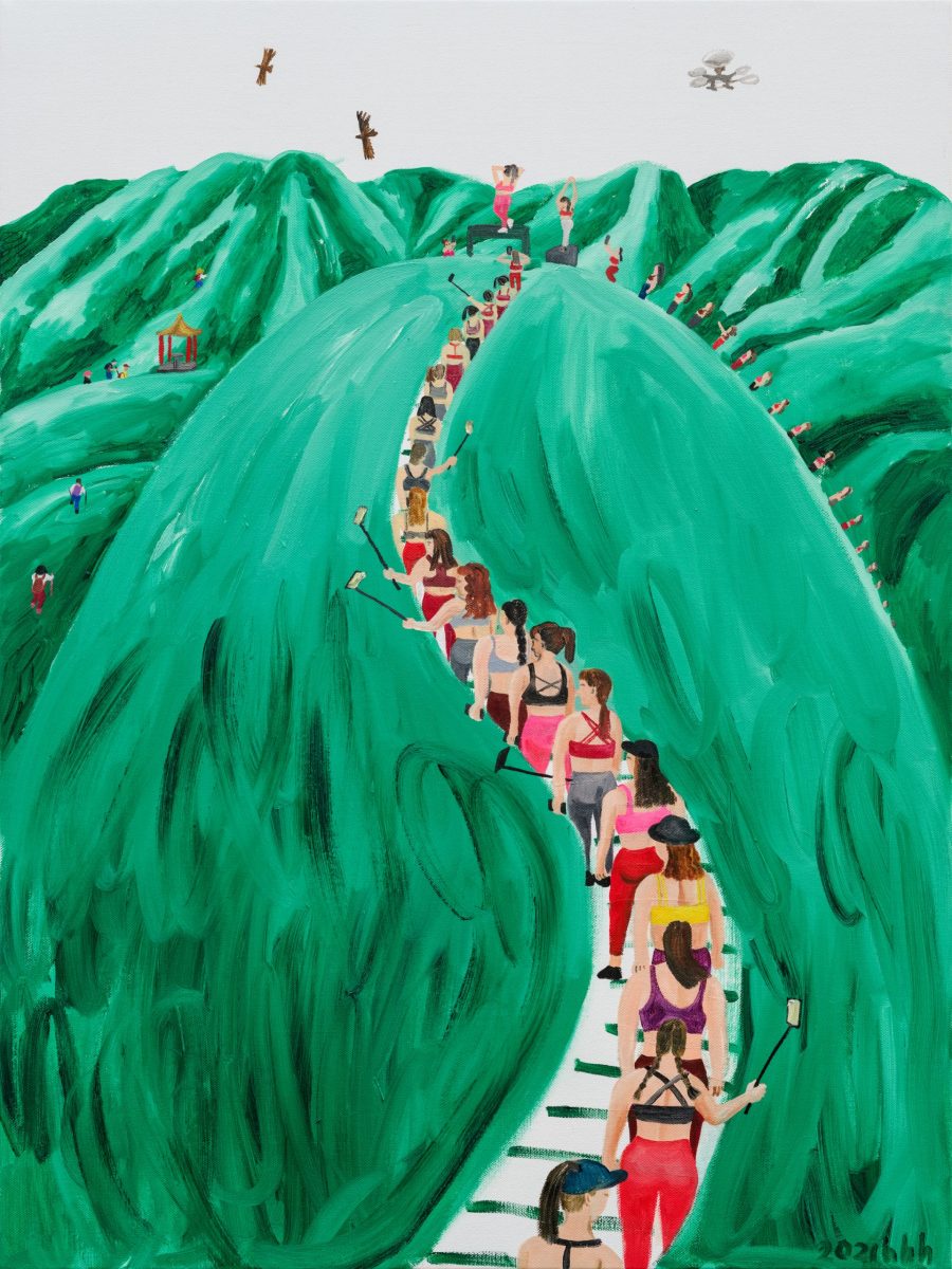 」。從畫中可以看到,成群幾乎衣著一模一樣的人類,摩肩接踵地走在步道上。有的人忙著擺 pose 拍照;有的人拿著長長的自拍棒自拍。這幅作品,反映出黃海欣對於登山網紅文化的反諷。