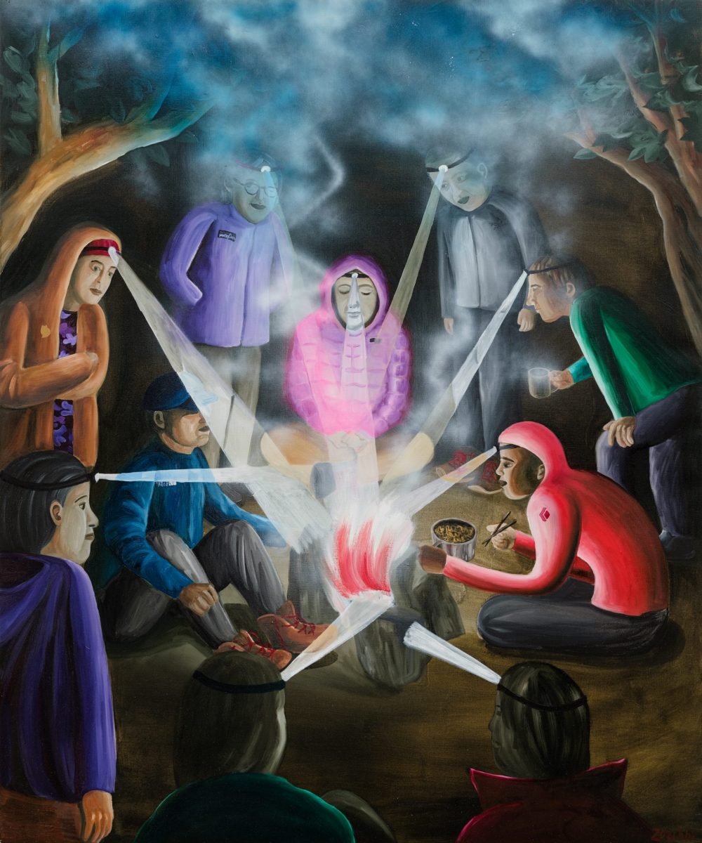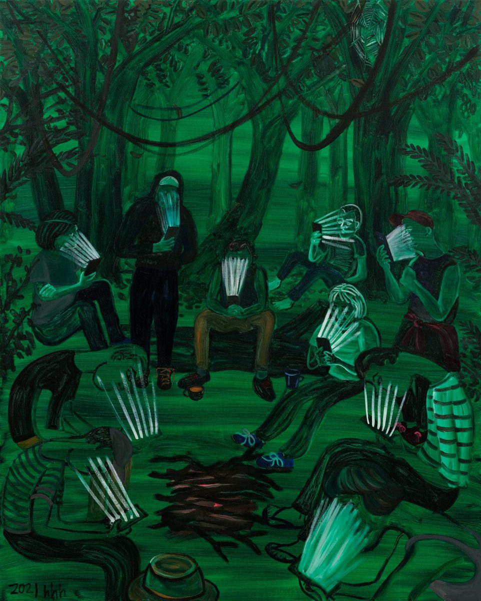 而在長老教導完大家如何生火後,大夥席地而坐,紛紛拿出手機開始滑。也成了黃海欣的筆下主題,而有了《認識火之後 After learning about fire》這幅作品。
