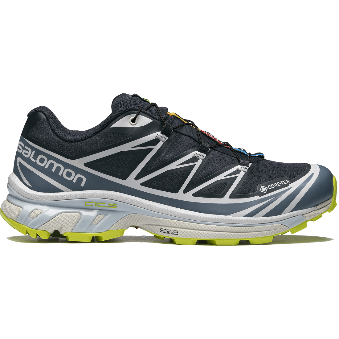 Salomon XT-6 GORE-TEX 搭載PFC-free 無氟技術,為環境生態保護盡一份心力,同時運用 Agile Chassis™ System 絕佳底盤結構,及柔軟吸震的中底 EVA 材質,提供穩定與緩衝保護;鞋面採用抗砂石材質與保護的鞋頭蓋設計,輕巧、耐用且透氣,體現其越野跑鞋地位。