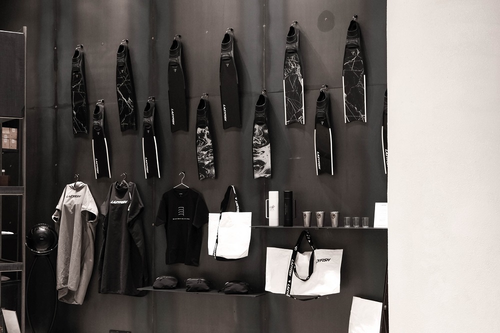 就在今年無意間闖入了 ROCKLAND P.L.U.S. ,當時正好遇到 LAZYFISH 舉辦的 POP-UP 快閃店,映入眼簾的是一雙雙黑白色系的蛙鞋掛在黑色高牆上,看著這些宛如藝術品的蛙鞋,心中默默浮現一個想法:如果我也能穿著 LAZYFISH 的蛙鞋在海裡就好了。