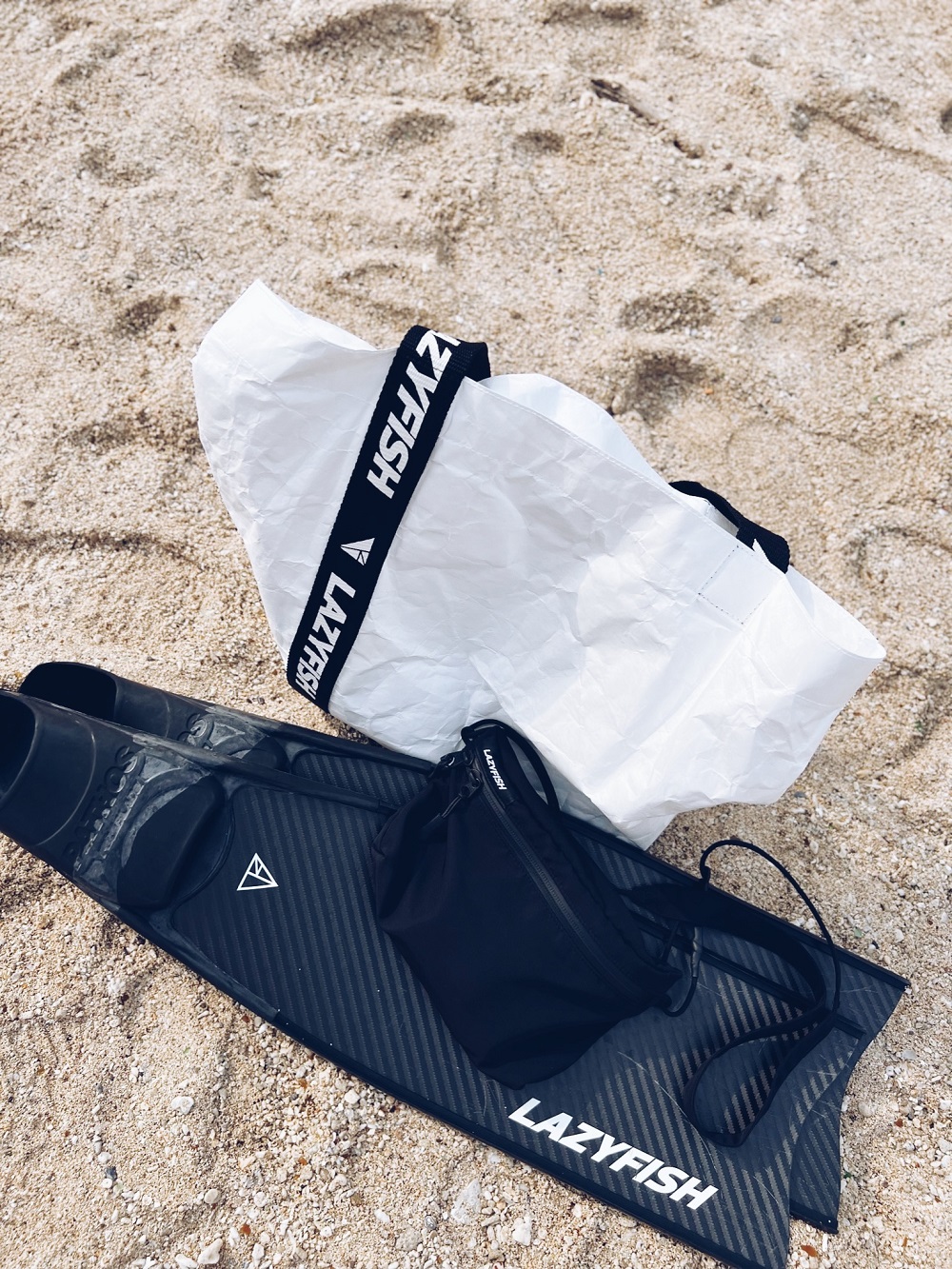 輕便耐用的高密度聚乙烯材料製成的托特包,超大置物空間,適合放入 LAZYFISH 系列之蛙鞋,方便攜帶蛙鞋與收納存放。在小琉球移動時,將蛙鞋抱在身上,托特袋便可以放置毛巾衣、暈船藥、手機、錢包等物品。