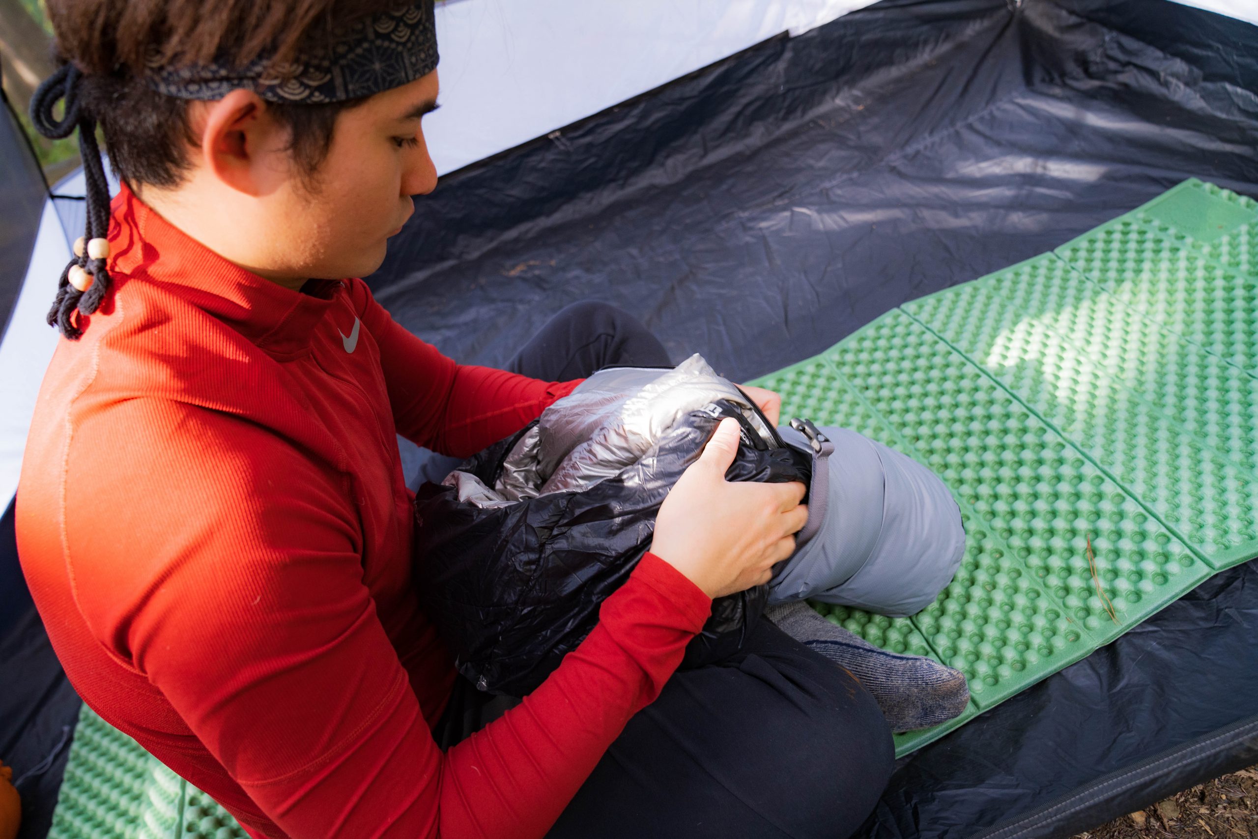▲發現了嗎? 將 Rab Mythic Ultra Jacket 收納成袋,搖身一變成了戶外枕頭,一覺好眠保暖,又省下了多帶一顆枕頭的重量。
