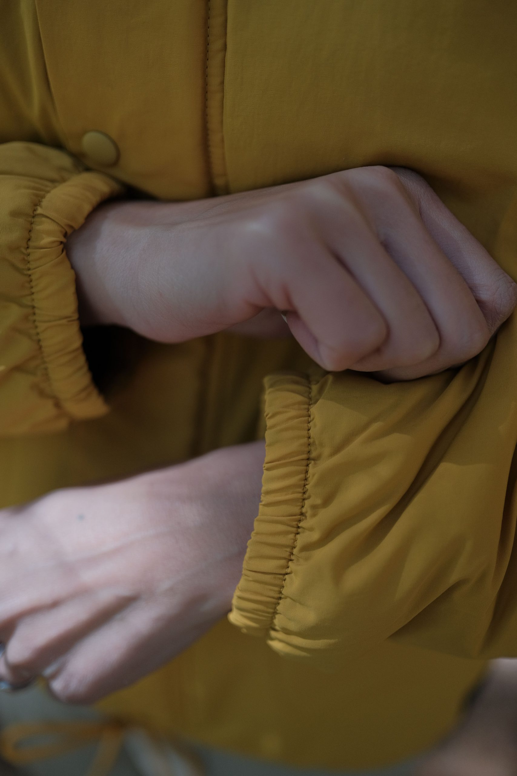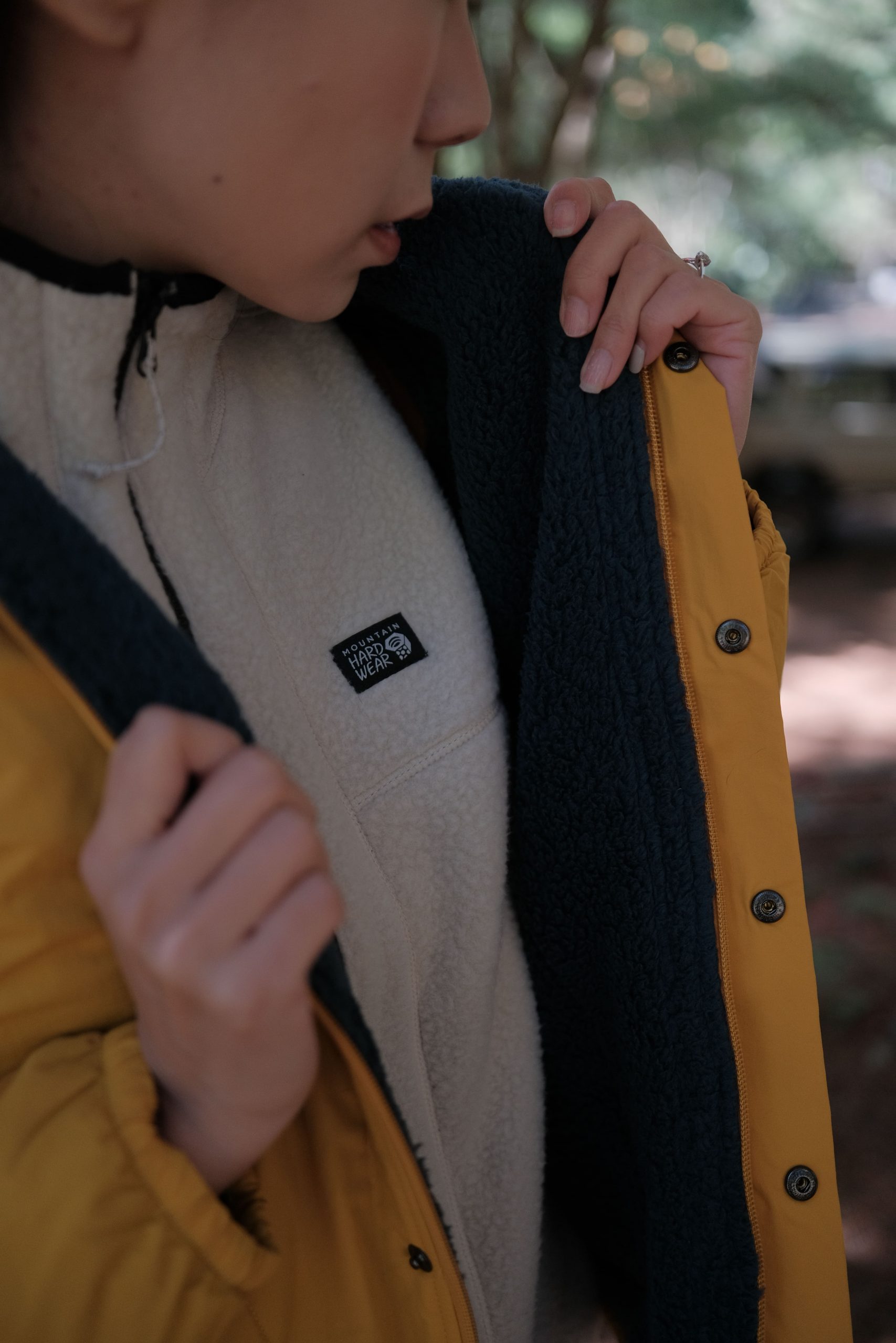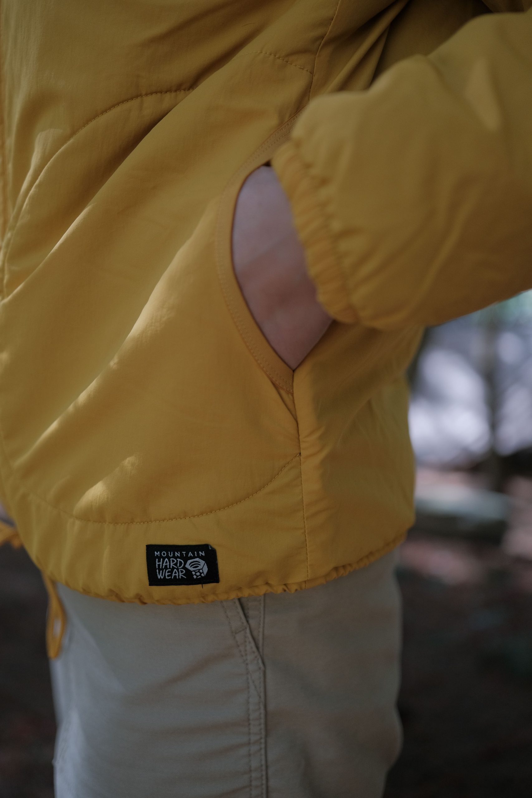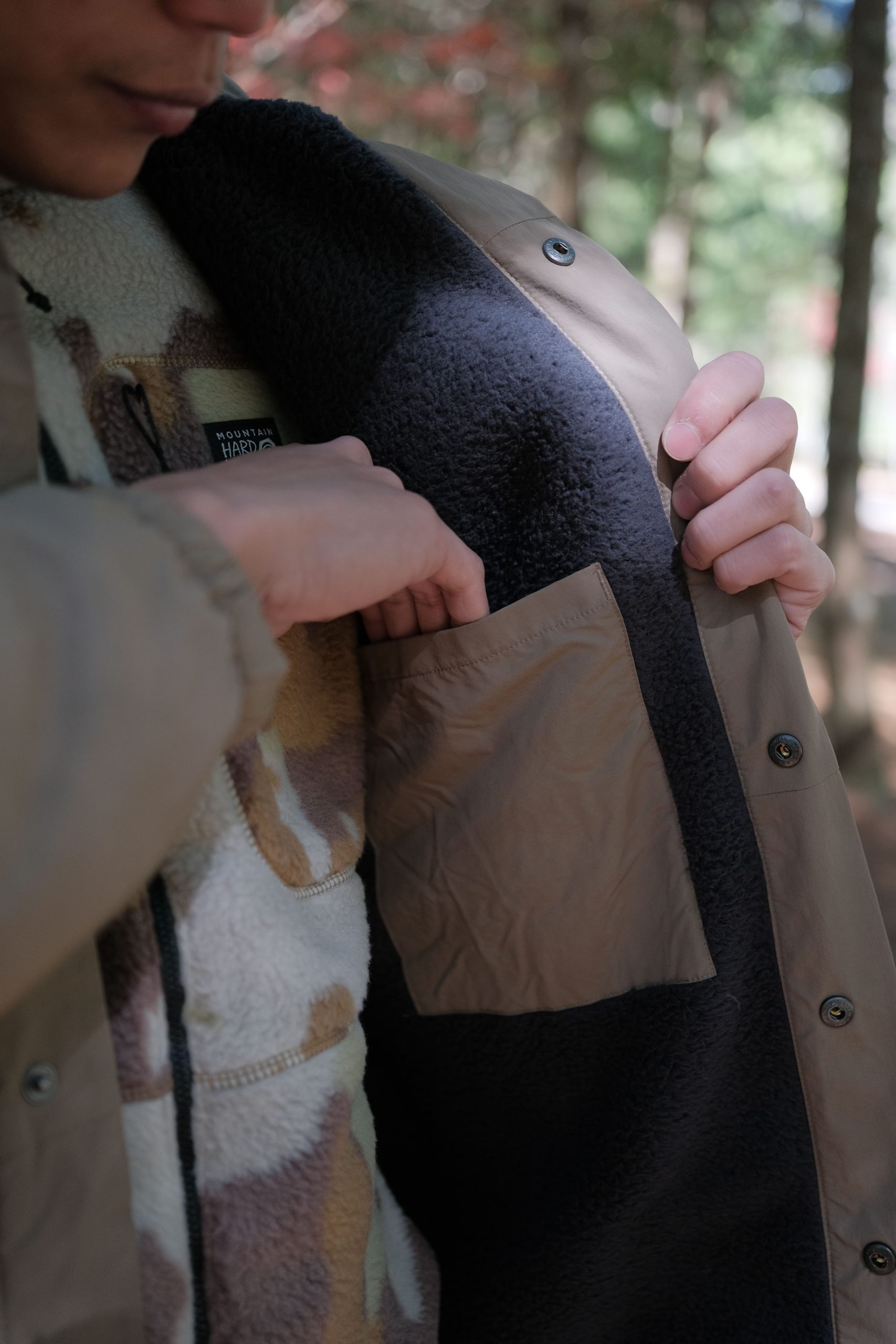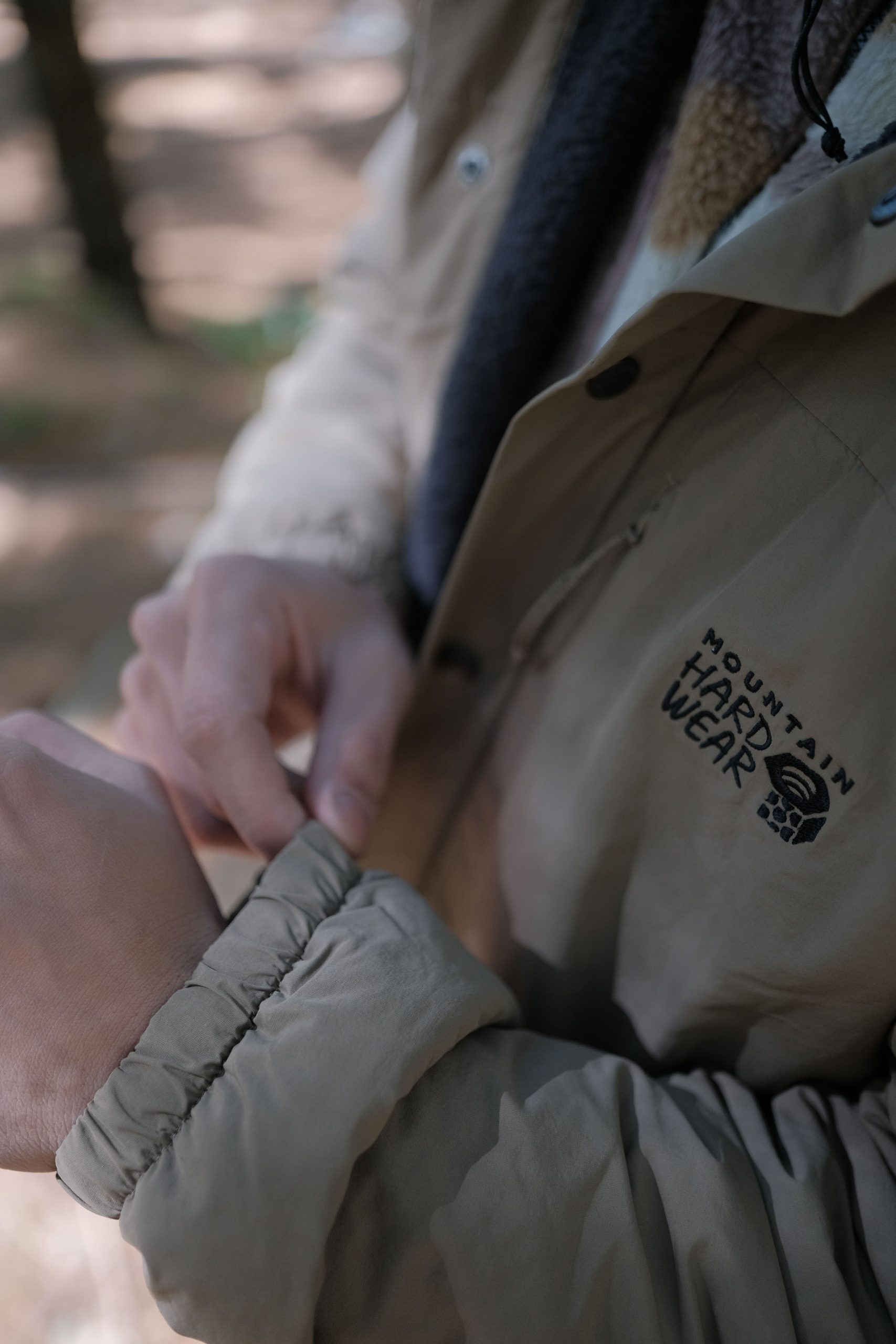 Mountain Hardwear HiCamp™ 外套外層尼龍面料,保暖的同時還展現了絕佳的抗風、抗撕裂、防水特性,在我們走進茂密的樹叢或狹窄的林間,不用擔心因為被樹枝或長草勾出線頭或劃破;當我們走到位於風口的溪畔,縮口的手袖和綁緊外套的下擺,不僅在活動時提供良好的固定,衣服不隨意移動,防風效果加分,防水的面料也阻擋了湍急溪水帶來的水霧,保持衣物乾燥。