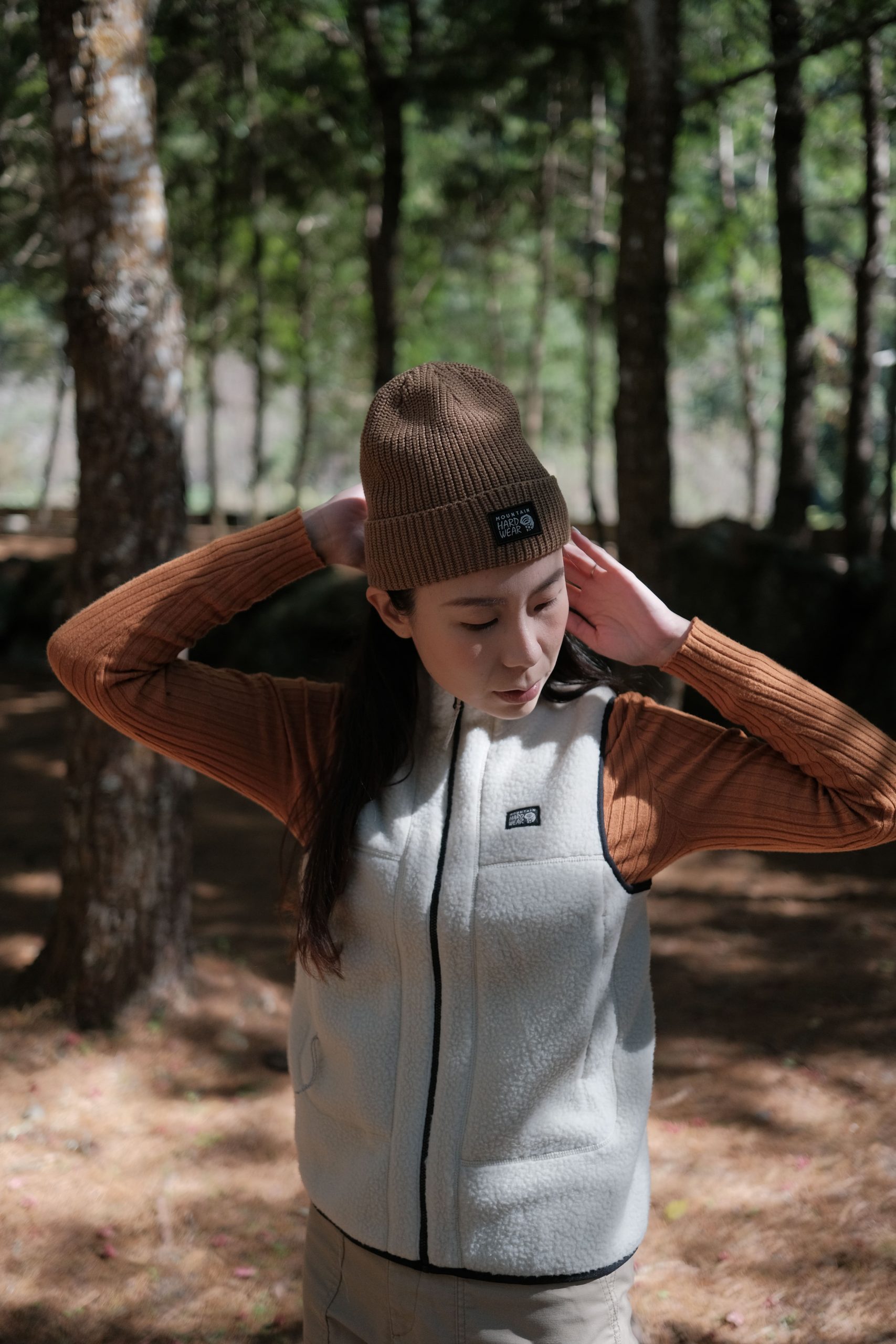 ▲ 配戴帽子防止冷風吹到頭部造成頭痛,更能有效保暖頭部。Jeffrey 配戴的是 Polartec High Loft Cap 日系保暖飛行帽,耳罩保暖、可上翹及下翻的設計,為怕冷的他做足頭部及耳朵的保暖。Elvy 配戴 Cabin to Curb Beanie 針織反折豆豆帽,秋冬經典象牙棕色,點亮好氣色,反摺設計在氣溫更低時可以往下遮蓋耳朵。