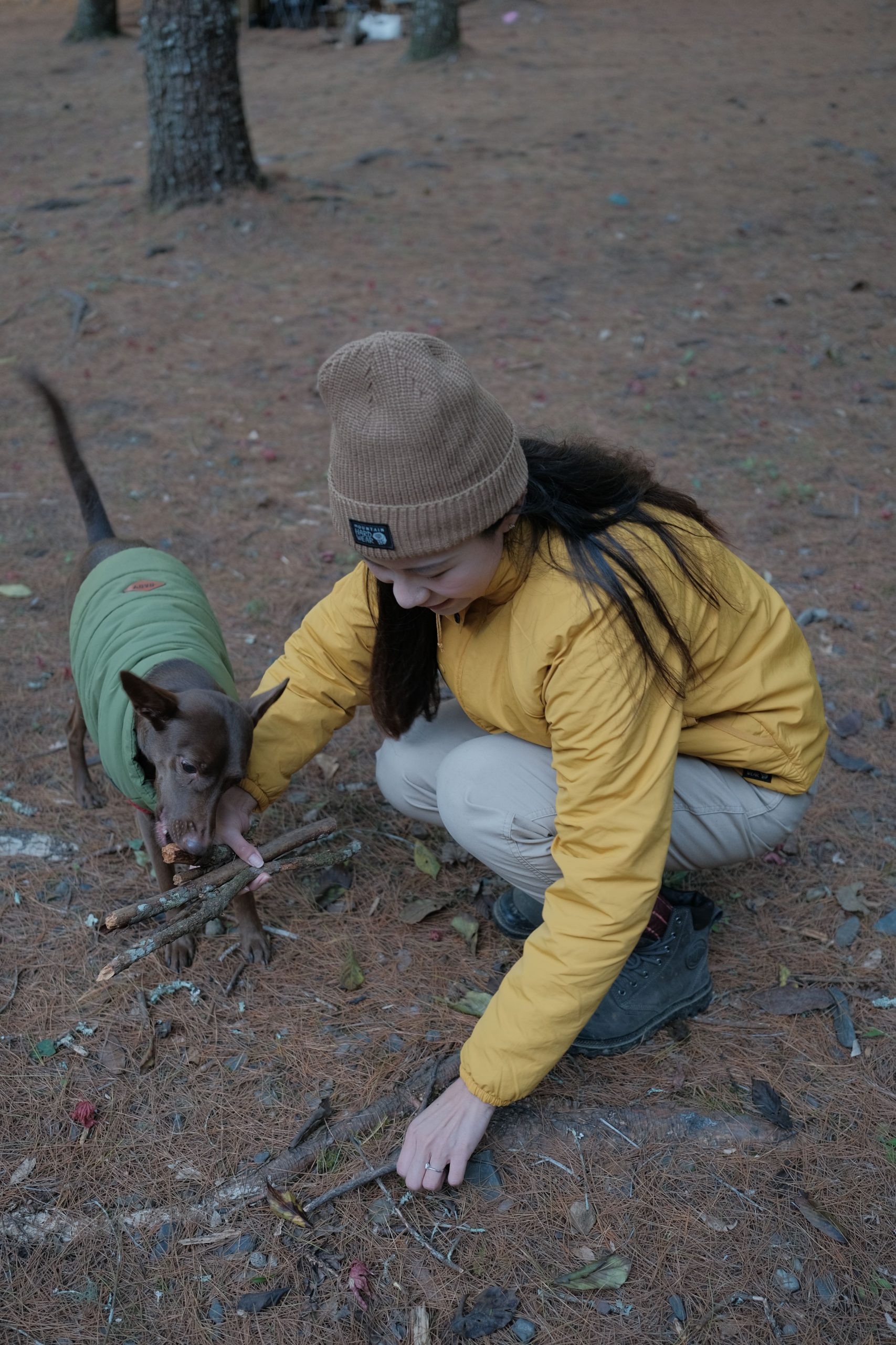 每到新的紮營點,我們喜歡在白天帶著狗狗,沿著山路小徑散散步探索周遭環境,同時享受大自然的寧靜與氣息,撿些松果、枯樹枝當作晚上營火的木柴和燃料。