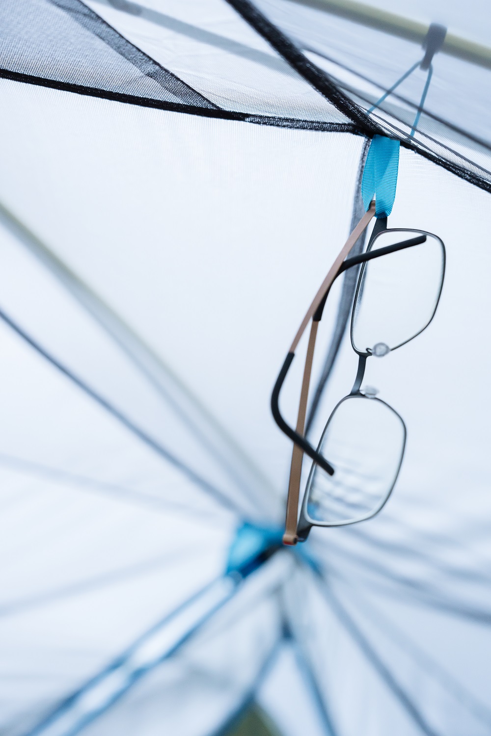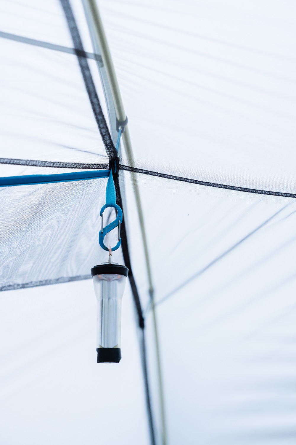 而內帳最頂端也設計了一個扁扁的三角形置物空間,讓我們不用帶營燈、只要把頭燈放進去,就可以變成照亮整個帳篷的燈源,這樣就不用再戴著頭燈吃飯或聊天了。我對這設計簡直讚不絕口,實在太聰明了…而在內帳正上方,還有成正方形排列的四個小吊環,可以吊真正的營燈,或睡覺時直接把眼鏡吊上去,就再也不怕壓到囉!