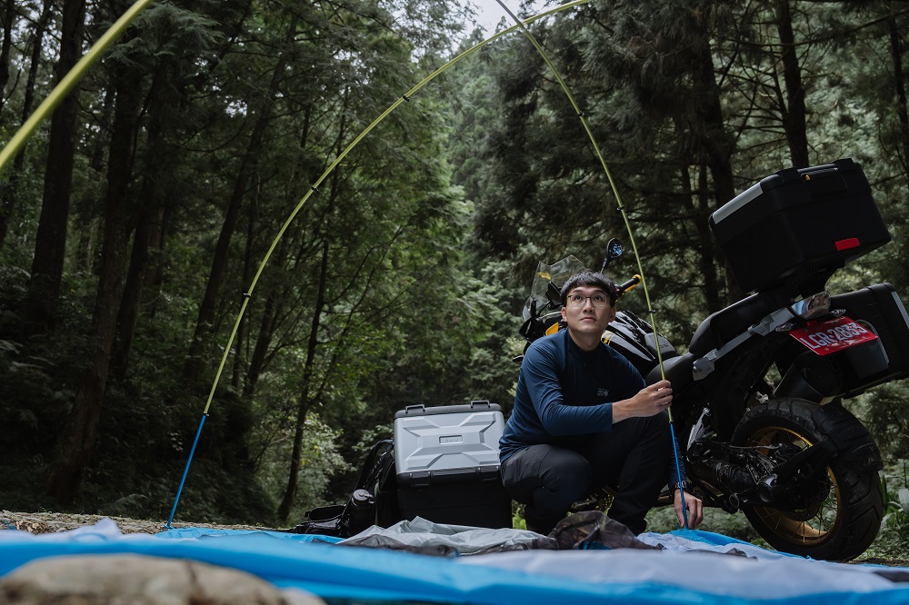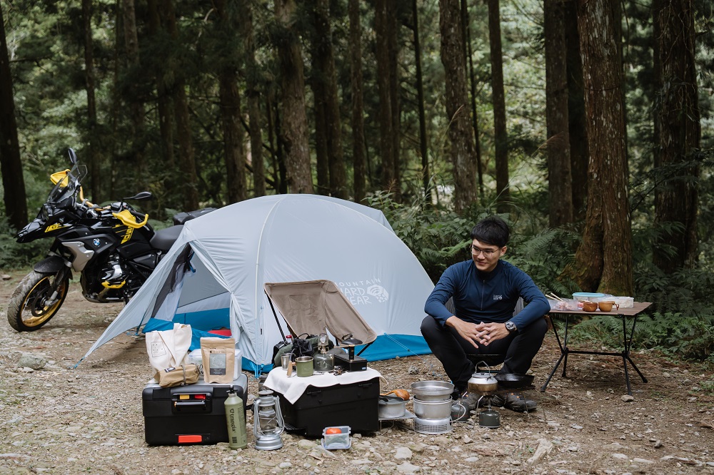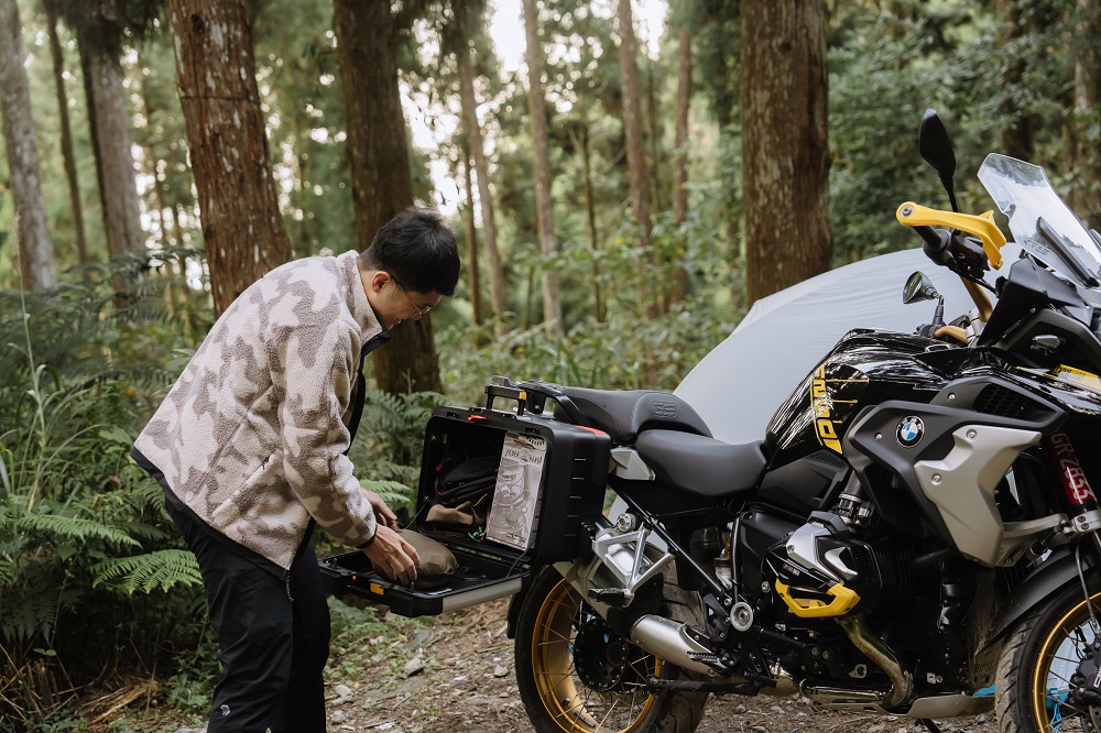 但是!「機車露營」真的很輕鬆愉快,相較汽車,不僅可以找個小空地隨停隨睡不用背重裝走路,還可以與心愛的機車共眠,睜開眼睛就能看到德國工藝結晶與台灣森林的自然之美,構築成一幅兼備野性與理性、生命與機械同存的畫面,簡直是嚮往自由、喜愛機械的人們,最浪漫的旅行方式了。尤其雖然我已經用附掛三箱的BMW R1250GS 大鳥開外掛,並同時把露營桌綁在後座,但能帶的行李依然非常有限,免去了普通露營被人詬病「好像在搬家」的麻煩,而比較接近徒步野營的簡單。