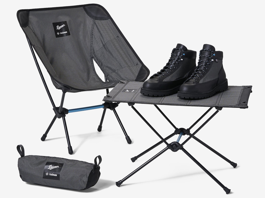 特別版的 Danner x Helino 桌椅除了維持 Helinox 的 DAC 鋁合金支架,再加上 Danner 的縫紉技術加強布料的強度,使原本就強韌的輕量化摺疊桌椅品質更上層樓。