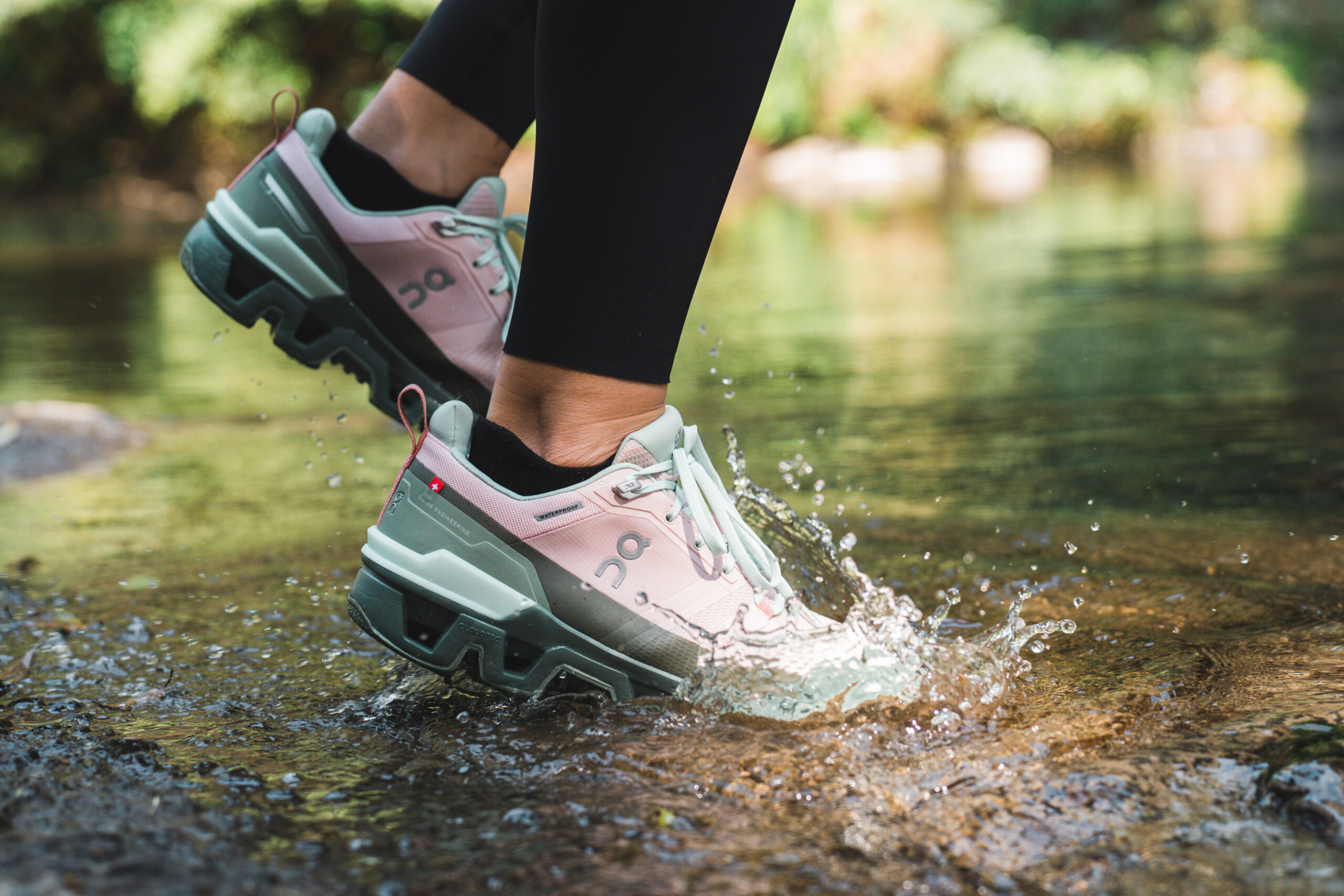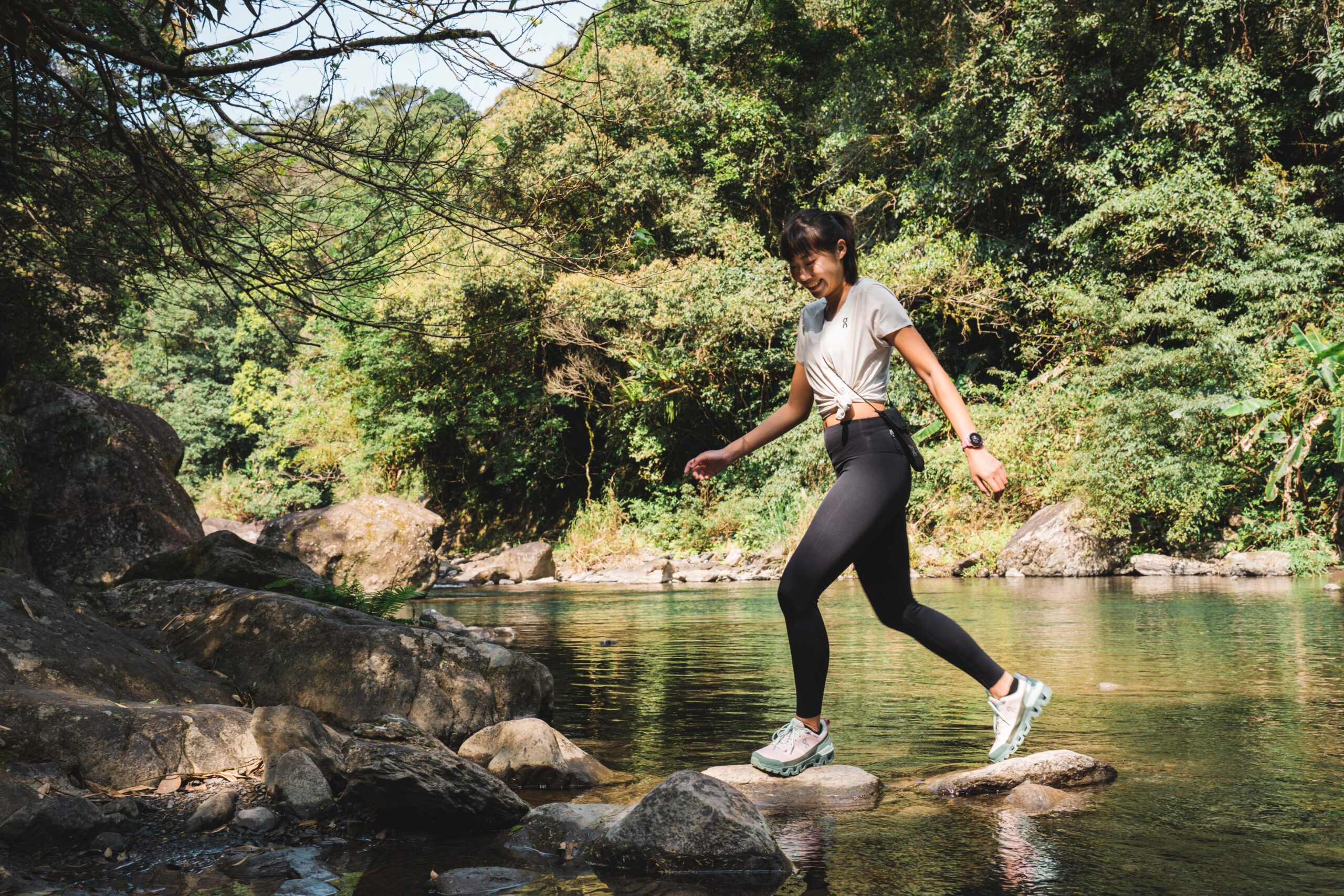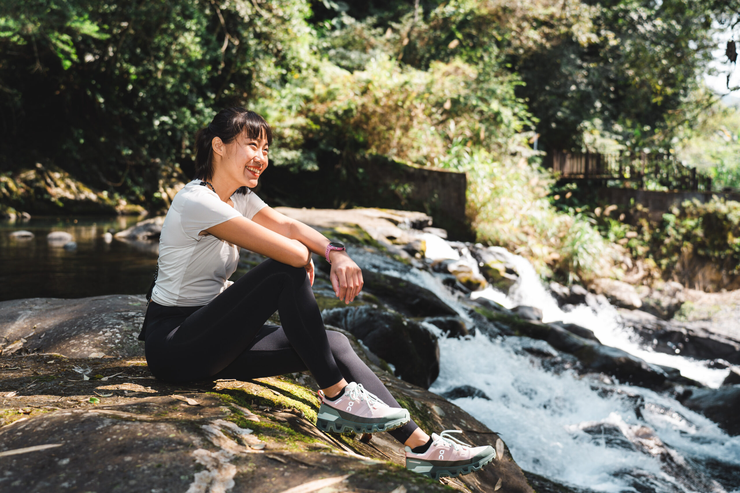 ▲ 薇安腳上這雙 On Cloudwander,擁有全地形適應的性能,不管是踏足石階、樹根、土壤皆能提供足夠抓地力,亦搭載品牌 20% 再生防水科技,即便用力踩踏溪水也依然保持足部全天候乾爽。