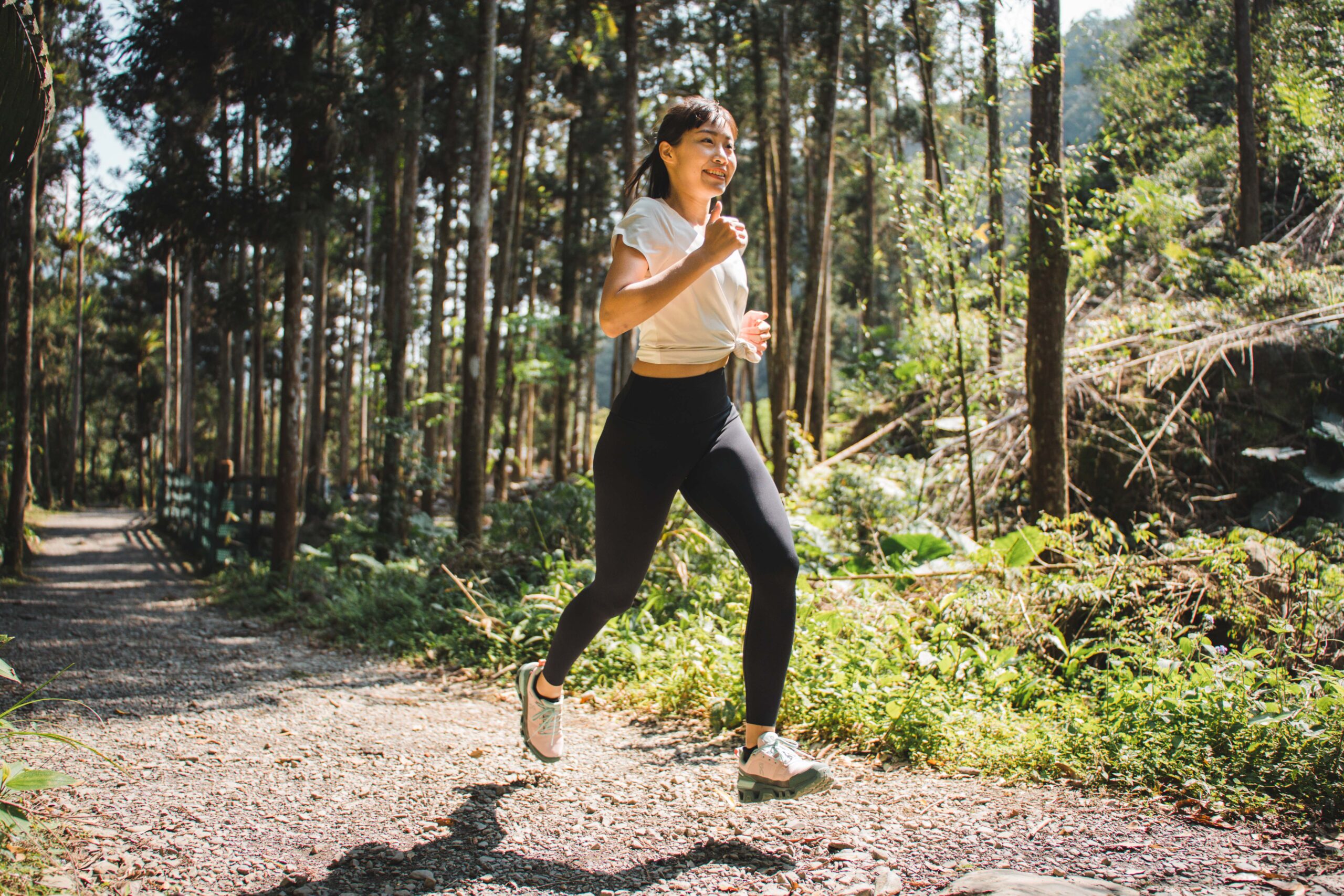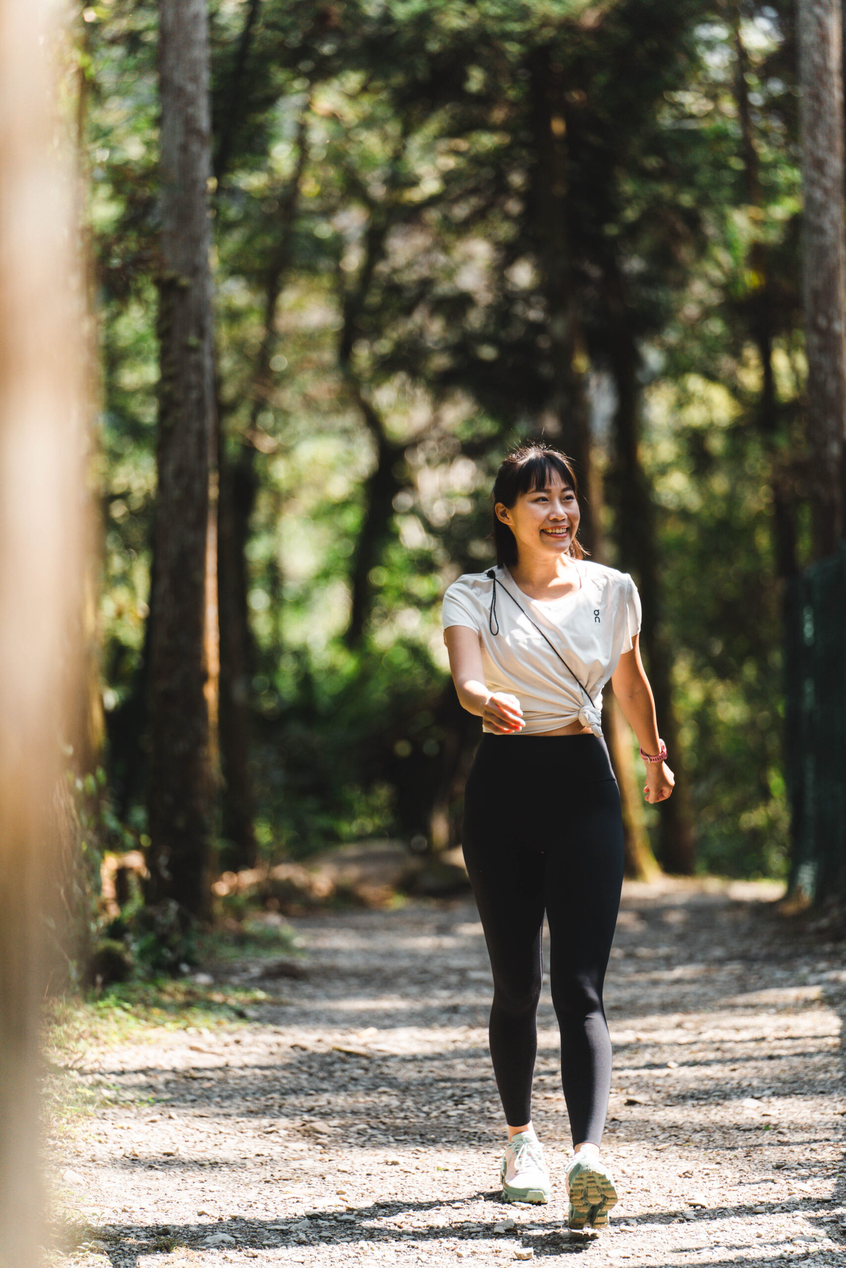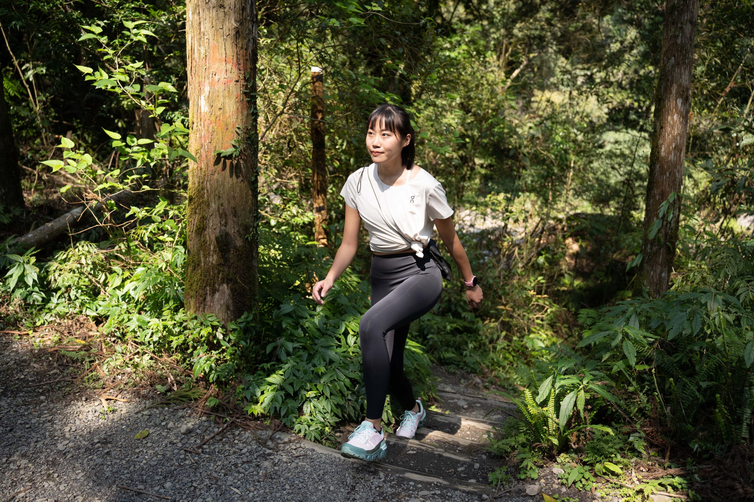 「你剛剛有看到吧?我剛在跑下坡時的那個踉蹌!但它卻穩穩地接住了我!」話鋒一轉薇安提到方才拍攝情境時的小插曲。薇安今日實際穿著 On Cloudwander 走在各種不同地形,樹根、泥巴、石階,甚至溪石等:「我覺得這雙鞋是恰到好處地提供足夠支撐又柔軟地回饋腳感。」
