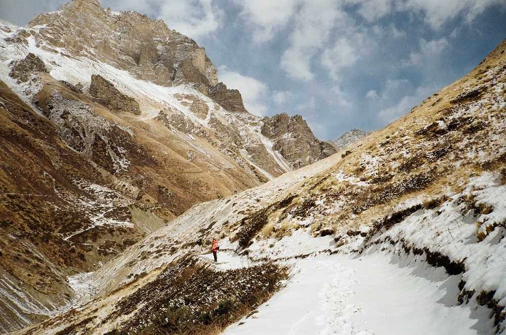 喜馬拉雅山脈多為礫石岩壁,沒有植披。走到3500公尺時,已經遍地結冰,一眼望去白雪皚皚,這才是喜馬拉雅山脈真正的美景!雖然選擇最冷的時間上海拔5400公尺,聽起來有點瘋狂,但相信也能給自己從所未有的考驗與挑戰。