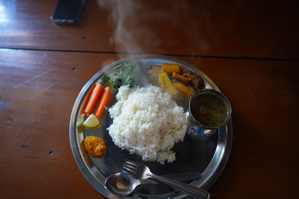 ▲這是尼泊爾的國民食物:達八。其實有點像是被規定好的自助餐,有青菜、咖哩、鹹湯、醃漬小菜,可以續一次
