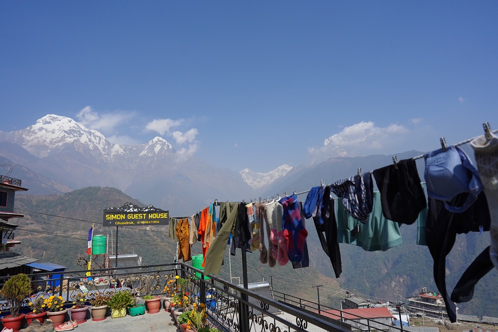 15天下山之後,抵達海拔2000公尺的小鎮,Ghandruk,甘德楚。我和夥伴們第一次脫下所有的衣服,三個人的衣服曬滿了所有曬衣繩。