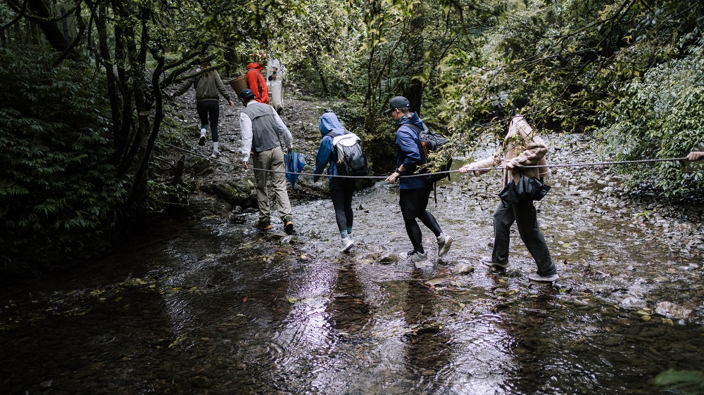 接著我們繼續前行,經過第二個石橋後,來到第二個涉溪點,前面有說到,前人在兩地來往時都是要透過淡蘭古道山徑,活動中還特地準備竹簍,讓大夥體驗還沒有登山包的時候,是如何負重行走於山林間。