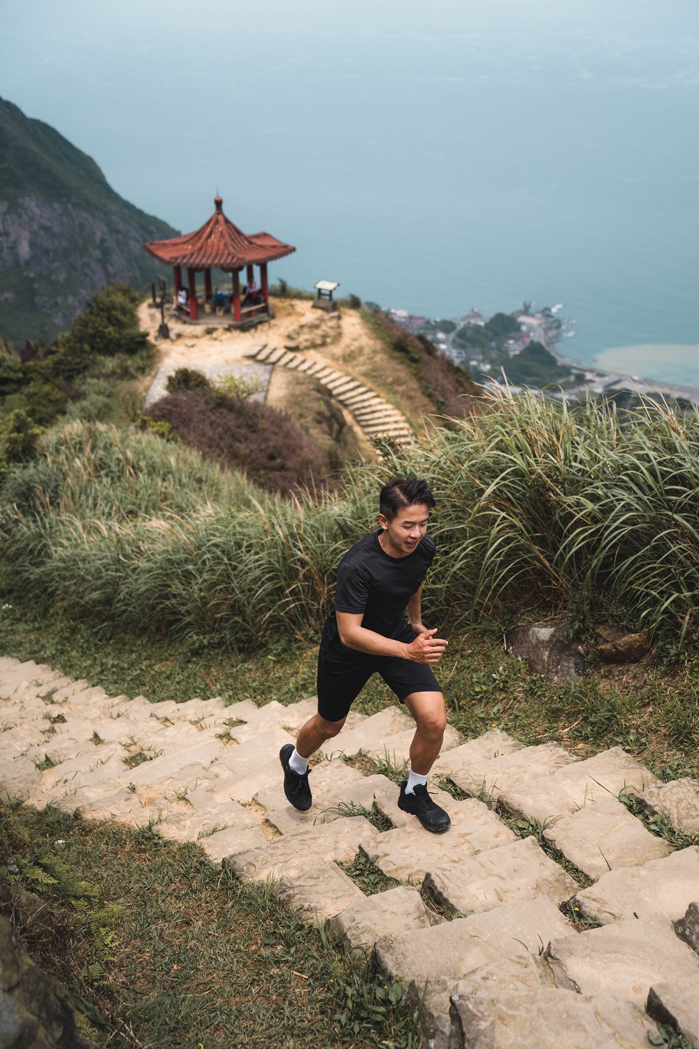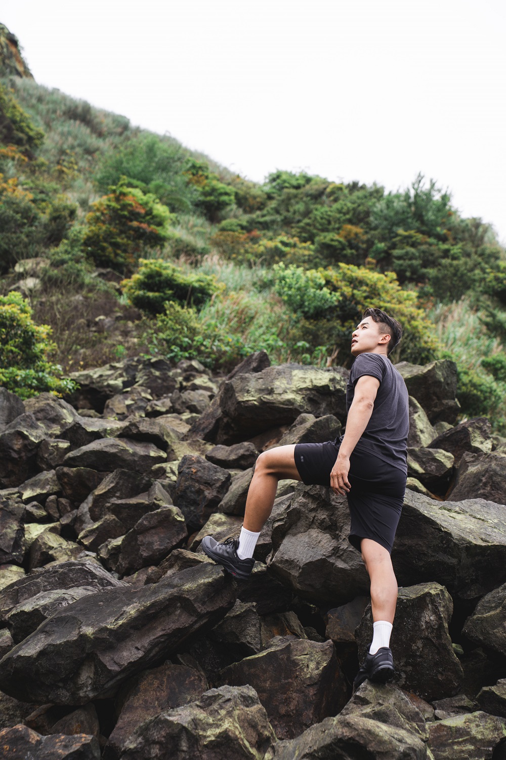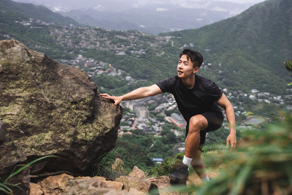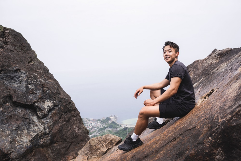準備登上山頂前,Ryan 卸下身上的物品置放於涼亭,彎下身再次繫緊鞋帶,穿著 Salomon OUTRISE GTX的 Ryan,輕盈的跑上最後一段階梯之路。「其實我的重裝鞋也是 Salomon,這次換上輕量的 OUTRISE GTX ,今天攀爬在東北角這樣特殊的大岩石、碎石礫、石階上,都有穩穩地抓住我的每個腳點。」Ryan 分享著。
